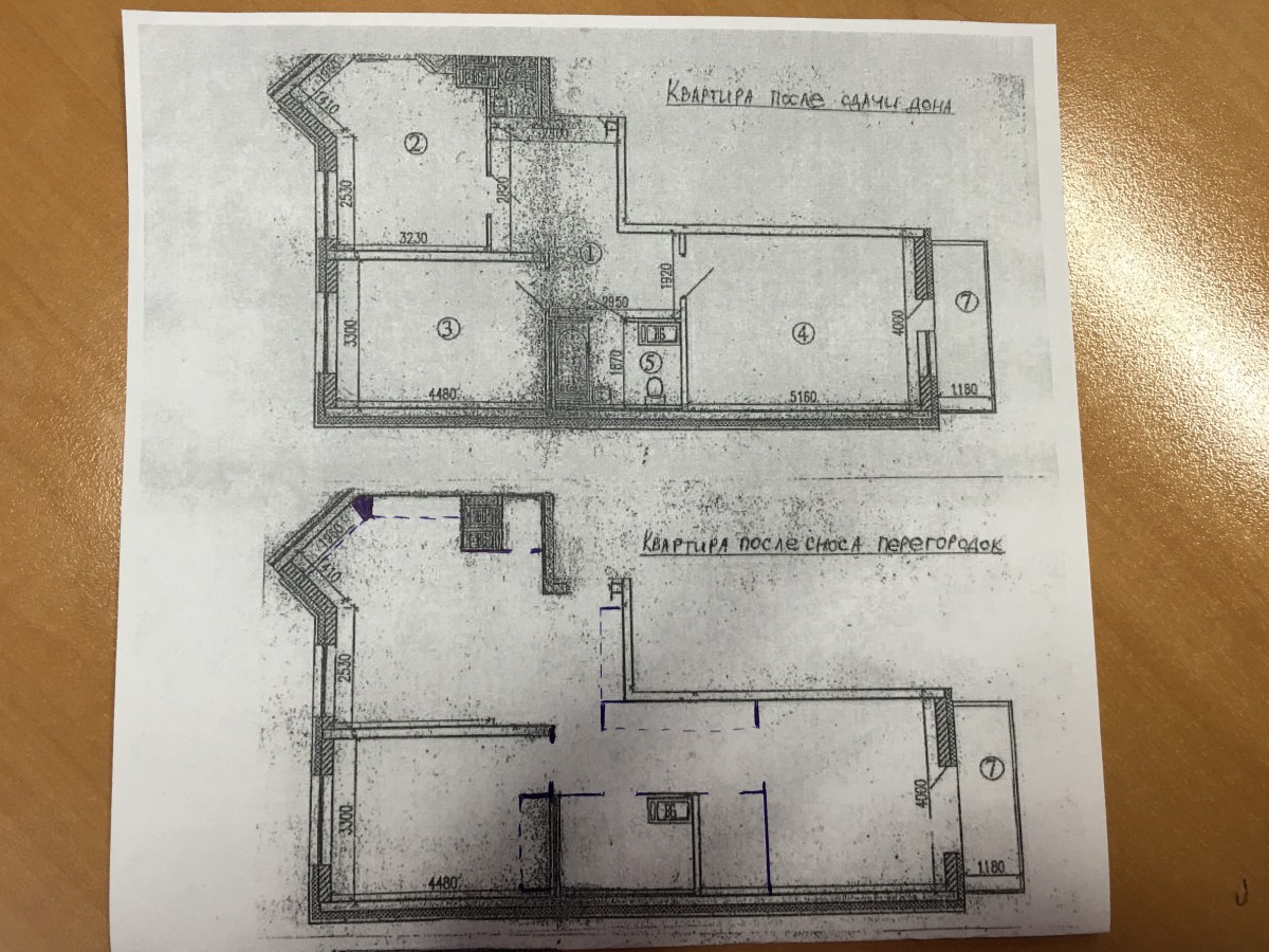 Вот еще один план, но качество оставляет желать лучшего. На нижнем чертеже показаны изменения: убрана стена на кухне, уменьшен второй санузел, от спальни отгорожена гардеробная шириной 1,5 м (под системы ИКЕА), созданы ниши под шкафы в коридоре и детской. Главное — решен вопрос с тупым углом на кухне: появился разделитель, создавший две прямые рабочие зоны.
