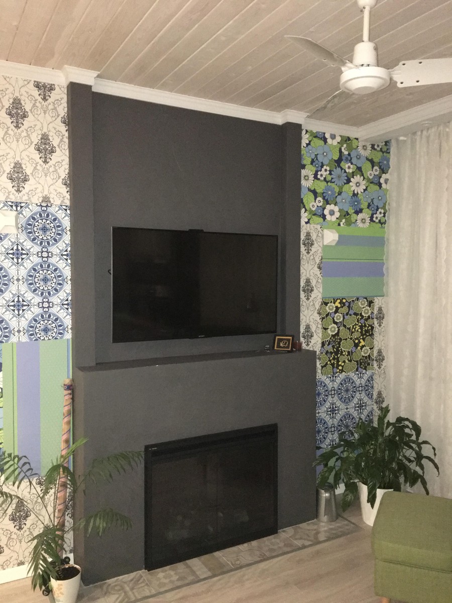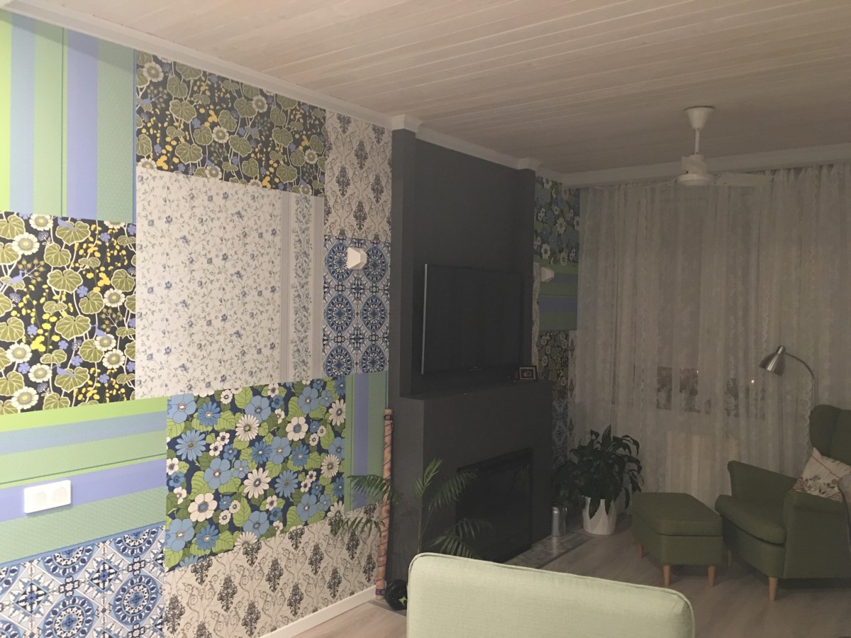 3. Акцентная стена в стиле пэчворк. Это второй элемент, отсылающий к дачной тематике. Поскольку все остальные стены в комнате и коридоре выкрашены в светло-серый, эта стена не кажется пестрой, а смело берет на себя роль яркого акцента, притягивающего взгляд.