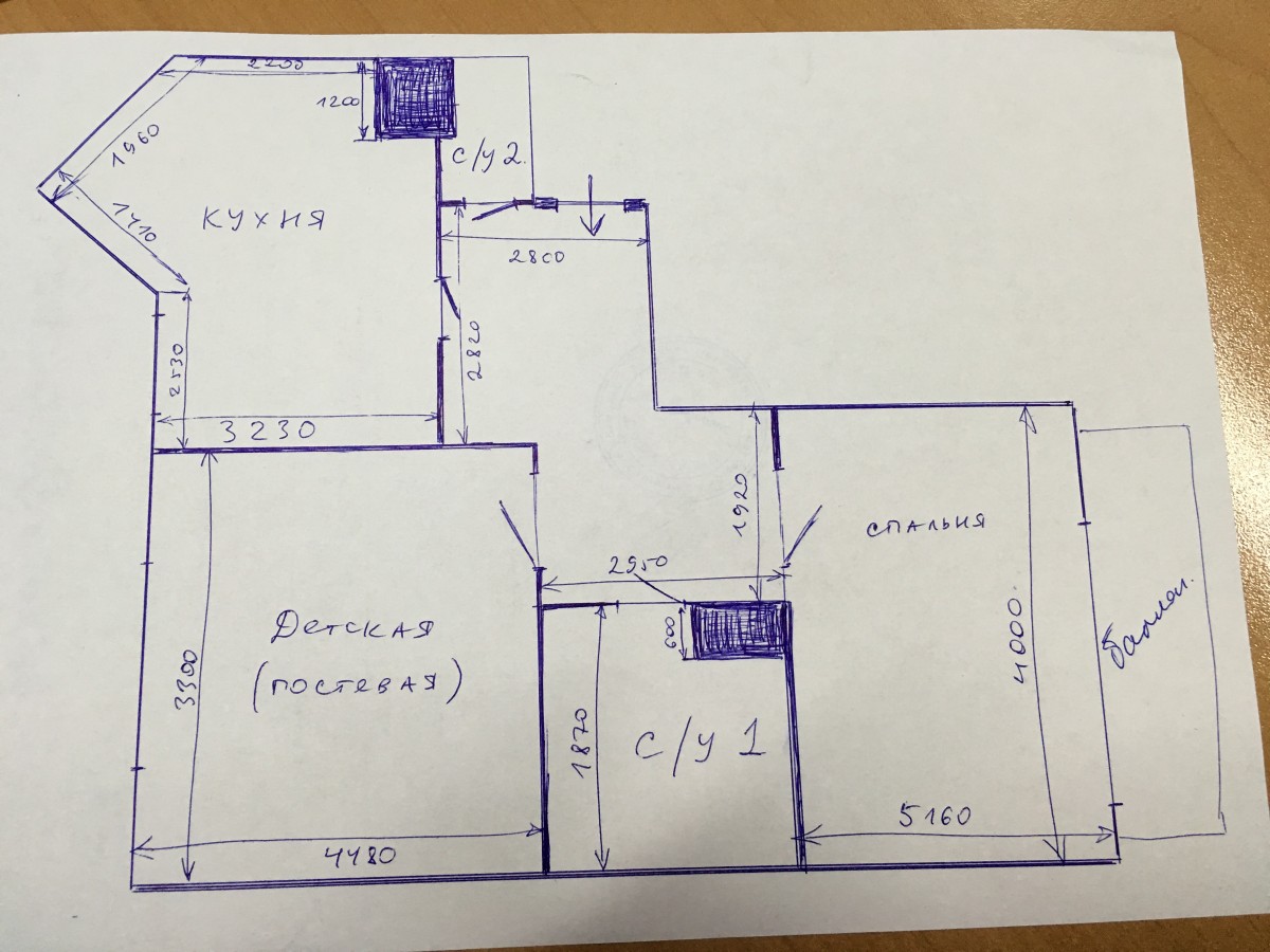 К сожалению, не могу найти качественный план квартиры до перепланировки, поэтому выкладываю схему, нарисованную от руки. Масштаб не соблюден, но размеры комнат указаны. Закрашенные квадратики — вентиляционные короба (у нас их два). В исходной планировке было три неудобных момента: 1) тупой угол на кухне, в который сложно вписать стандартный гарнитур; 2) большой, но несуразно зонированный коридор; 3) просторная крайняя комната 5х4 м, которая как спальня без шкафов казалась слишком пустой.
