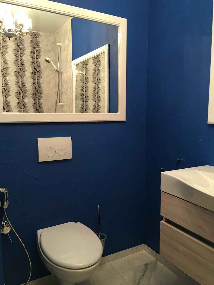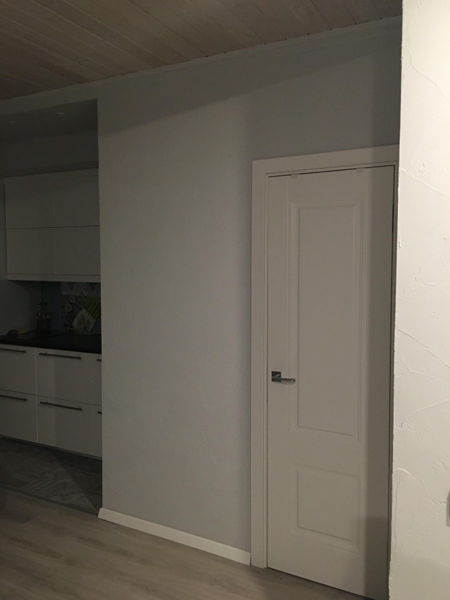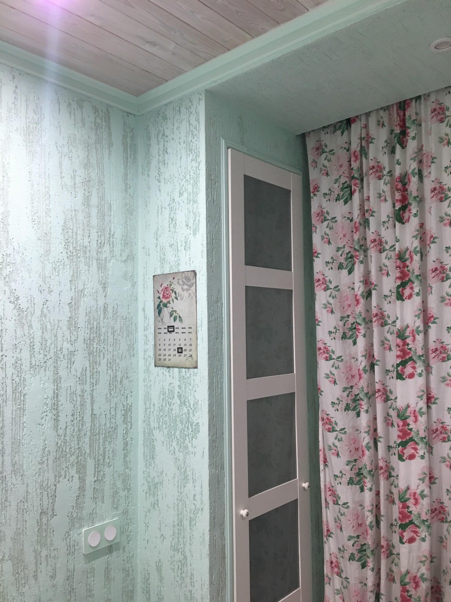 4. Декоративная штукатурка вместо обоев. Мы отказались от обоев, а выводить стены под идеальную покраску показалось дорого и сложно. Выбор пал на декоративную штукатурку, которую использовали везде, включая ванную комнату (кроме самой мокрой зоны). Получилось немного грубовато, особенно для будущей детской, но наш маляр заверил, что в любой момент стены можно будет выровнять и поклеить обои.