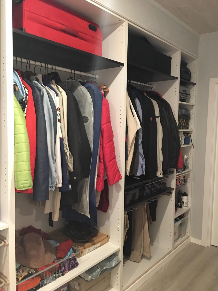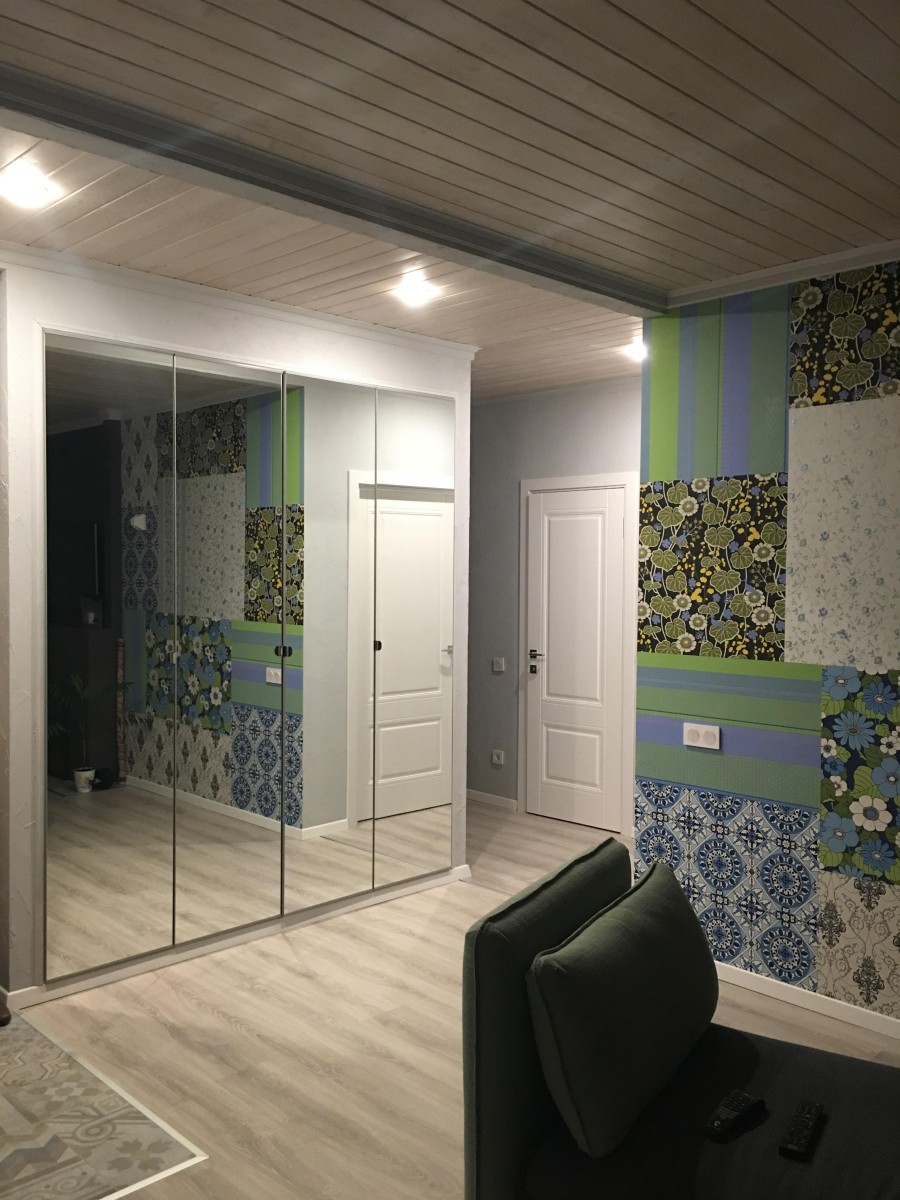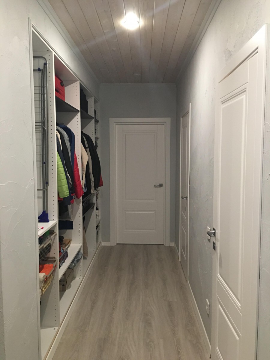 Большой коридор и большой шкаф в нем. Пока без дверок, жду акцию в ИКЕЕ. Вопрос на засыпку: какие двери выбрать — зеркальные или белые? Если белые, то глянцевые или с фактурой? Помогите советом!