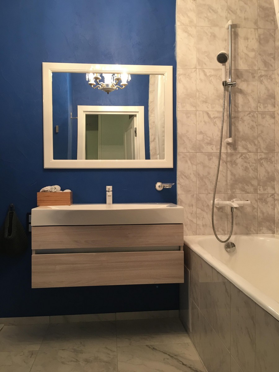 6. Ванная комната как полноценное помещение. Чтобы подчеркнуть, что это не просто санузел, а комната, мы повесили здесь настоящую люстру. Это единственная декоративная люстра в доме, так как к деревянным потолкам в других комнатах я не смогла подобрать подходящие светильники, и везде стоят встроенные. Также у нас два больших зеркала, которые закрывают технический люк со счетчиками. Очень удобно! Все принадлежности для умывания хранятся в тумбе или в шкафу в коридоре — на раковине царит идеальный порядок (мужа к этому уже приучила).