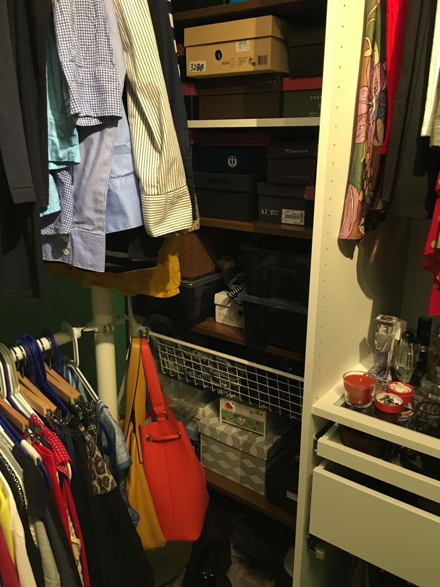 Дальний узкий шкаф: там хранятся коробки с обувью, сумки и корзина со всеми моими джинсами. Я предпочитаю развешивать вещи на вешалки — так намного удобнее.
