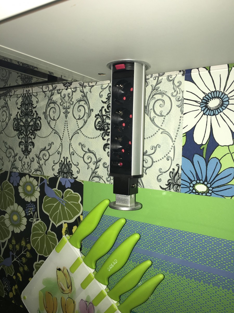 На фартуке кухни нет розеток — мы установили выдвижную розетку в верхнем ящике.