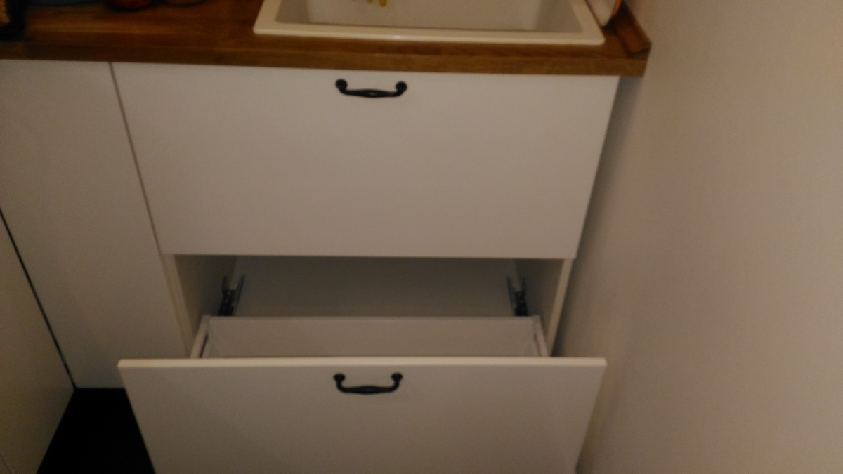 Краску для двух ящиков я колеровала самостоятельно, точно подбирая тон под стулья в столовой. Можно принести стул и убедиться в идеальном совпадении!