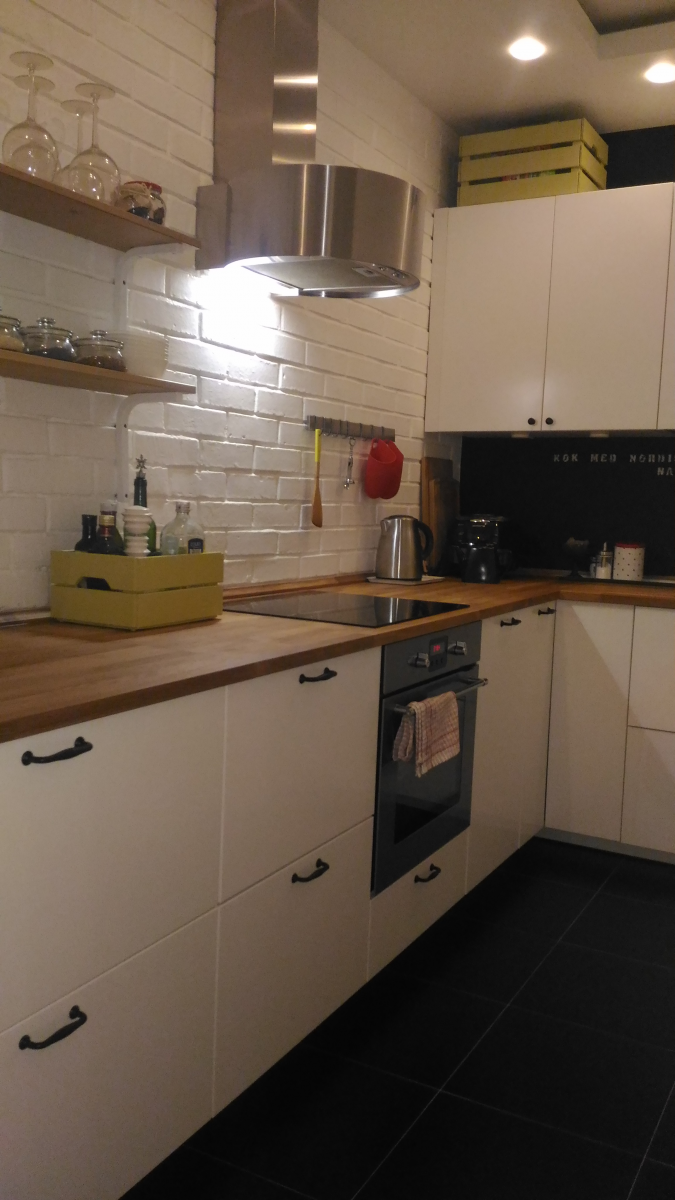 Фасады кухонного гарнитура — от IKEA, имеют легкий кремовый оттенок. Столешница изготовлена из массива дерева, а ее цвет практически идентичен оттенку дубового пола в других комнатах. Точечные светильники с белой прозрачной керамикой привезены из Италии, а смеситель выбран марки Timo. Стоит отметить, что фотографии сделаны вечером — при дневном свете пространство выглядит еще светлее и просторнее.