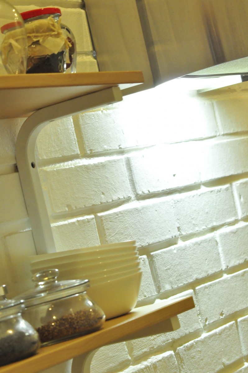 Пол выполнен из черного матового керамогранита с фактурной поверхностью и белой эпоксидной затиркой, а главное — он оборудован системой подогрева. Стены окрашены в нежный цвет «яичная скорлупа», что создает светлую и уютную атмосферу. Декоративная кирпичная кладка на кухне гармонично перекликается с кирпичами на балконе, которые видны через стеклянную дверь. Этот визуальный прием отлично смотрится из гостиной.