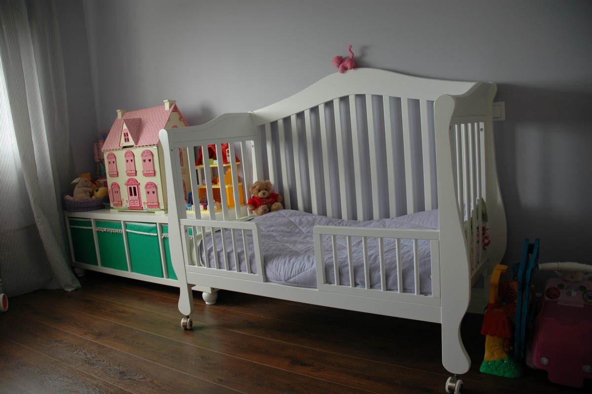 Мы выбрали кроватки от Джованни. Их главное преимущество — трансформация: когда ребёнок подрастает, передний бортик можно снять и заменить на невысокий защитный, а позже убрать и его, получив удобный диван. Долгое время остро стоял вопрос хранения игрушек — их количество растёт в геометрической прогрессии, причём почти всё приходится покупать в двух экземплярах, чтобы избежать конфликтов. На следующих фото — результат маминой уборки:
