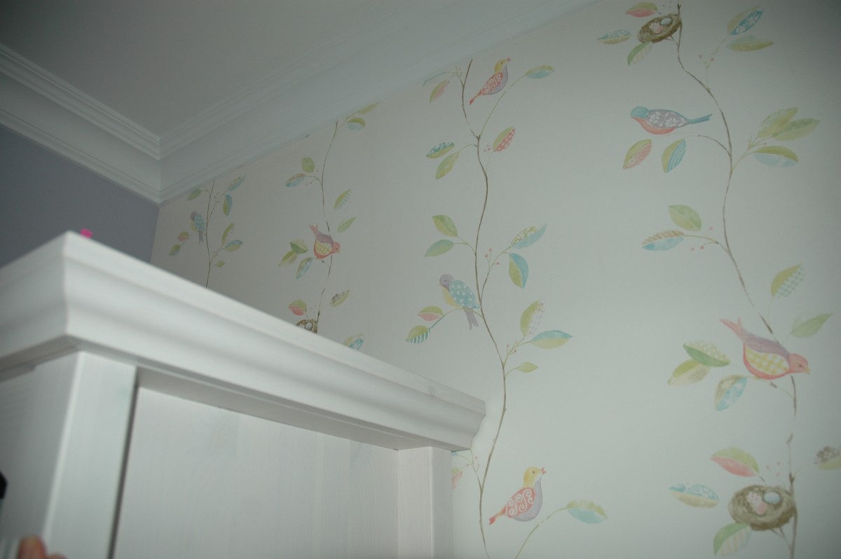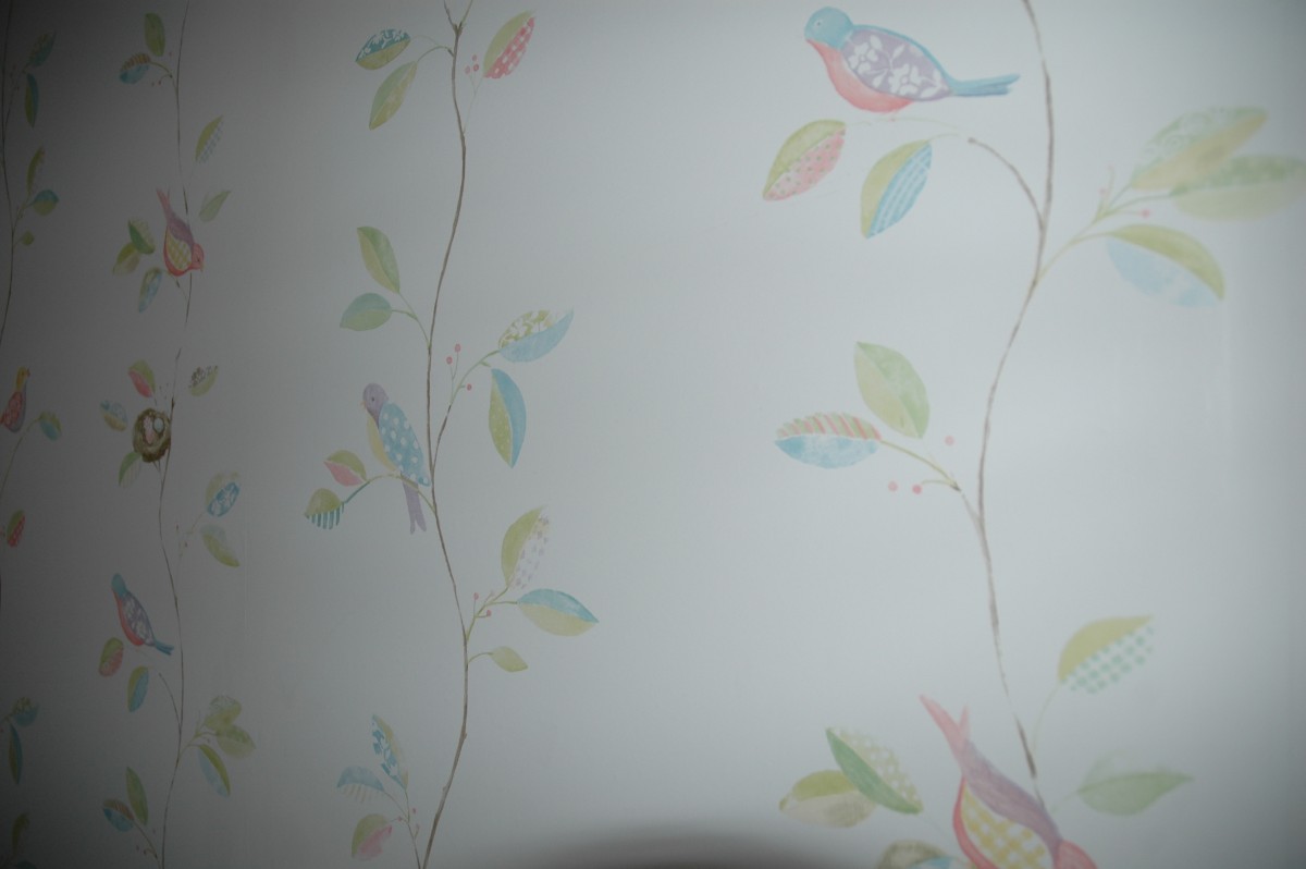Меня сразу покорили эти обои с птичками нежных пастельных тонов, которые выглядят как ручная акварельная роспись. Я заказывала их в непростой период, когда курс доллара был высоким, и ждала поставки почти два месяца. Но альтернатив я даже не рассматривала — настолько они были идеальны. Для стен я выбрала нежно-сиреневый оттенок, который перекликается с цветами на обоях. К сожалению, камера не всегда точно передаёт цвета, но на следующих двух фотографиях оттенок стен наиболее близок к реальности: