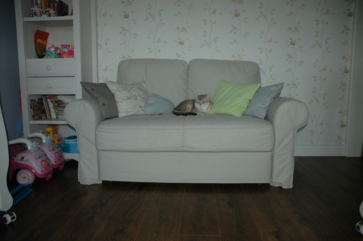Это сделано мамиными руками для любимых дочек. Мне самой процесс доставил удовольствие, а они, возможно, когда-нибудь это оценят. Покрывала у нас двусторонние, и если поменять шторы или перевернуть их, комната сразу преображается. От ковра мы отказались — в квартире очень тепло, и дети комфортно играют на полу. Иногда они раскидывают подушки с дивана и сидят на них. Так и убираться проще. Весь текстиль съёмный и отлично переносит стирку, включая чехлы дивана.