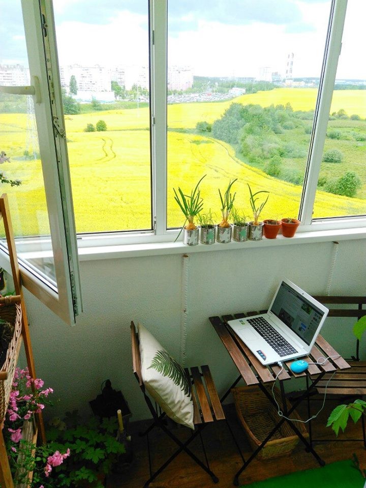 Я понимаю, что это не руководство по утеплению или установке систем хранения. Моя цель — показать, что даже на небольшой лоджии можно создать что-то для души без масштабных вложений и строительных работ. Жаль, что у меня нет фотографии террасы в вечерних огнях, зато есть снимок, как я работаю на свежем воздухе — это ли не счастье в городе?