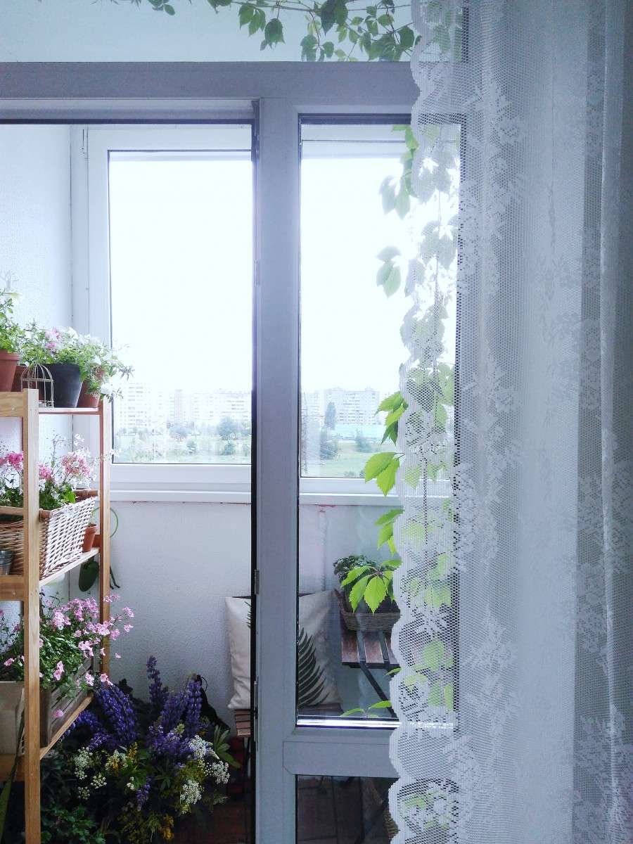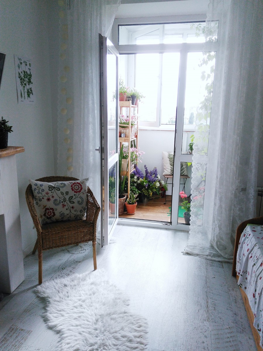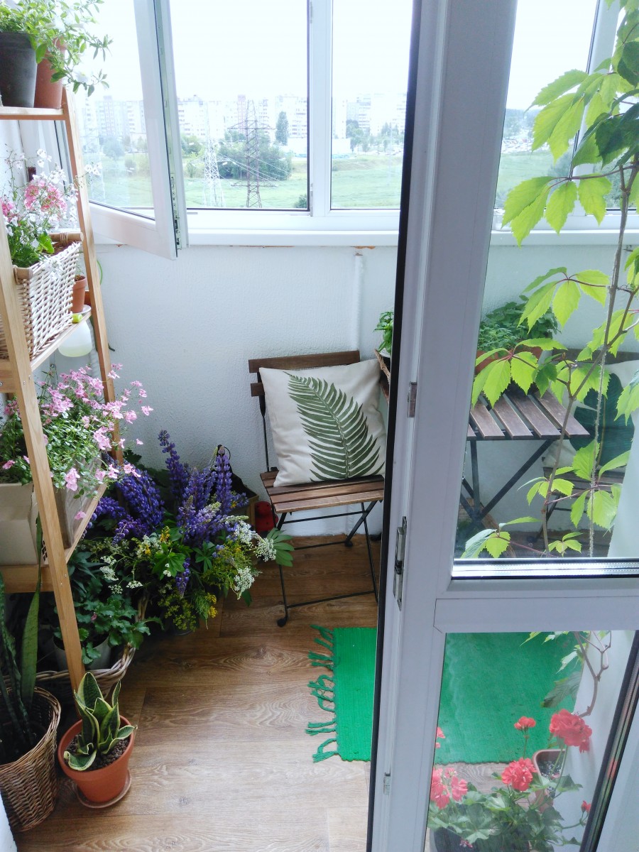 Мне, как известному на сайте энтузиасту, который предпочитает декорировать то, что не всегда требует капитального ремонта, досталась от застройщика небольшая лоджия площадью 3,4 кв. метра. Исходные условия были простыми: оштукатуренные и покрашенные в белый цвет стены, остекление и больше ничего. Идея положить на пол доску не осуществилась из-за конструктивных особенностей двери, поэтому в качестве практичного решения был выбран качественный линолеум «Таркетт» и установлен недорогой подоконник. На этом этап, который можно назвать ремонтом, был завершен, и началось самое интересное — создание уюта.