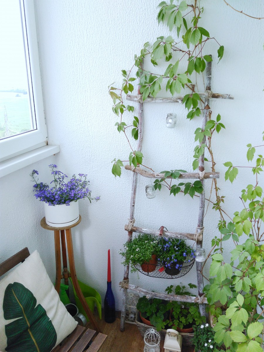 Я сознательно отказалась от загромождения пространства. Вся мебель была подобрана тщательно и функционально: на акции куплены складные стол и стулья из акации, а также стеллаж из сосны, который я дополнительно покрыла морилкой для придания благородного оттенка. Особой гордостью стала декоративная лесенка, которую я собрала самостоятельно из веток и стволов поваленных деревьев. Теперь, находясь внутри квартиры, я вижу через балконную дверь не хаотично развешенные вещи, а этот умиротворяющий уголок.