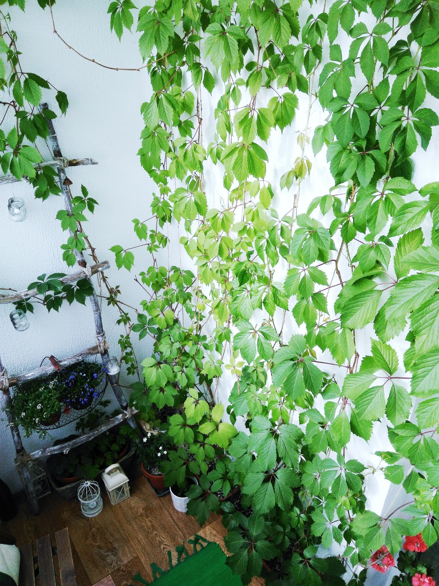 Третий год я озеленяю пространство девичьим виноградом. Это прекрасное решение для создания тени и уединенности. Лоза уже почти сформировала живую арку вокруг двери, что выглядит невероятно живописно.