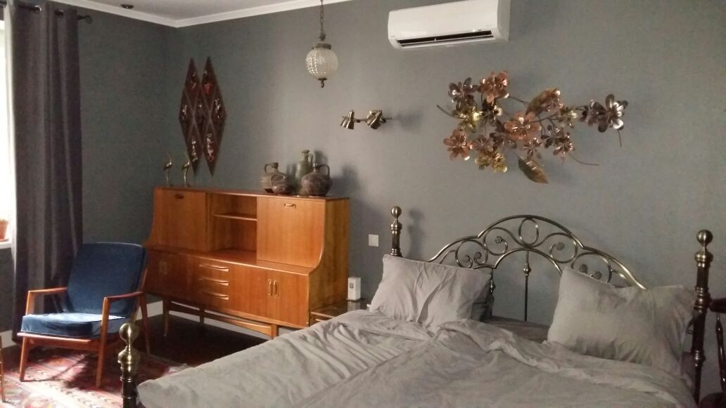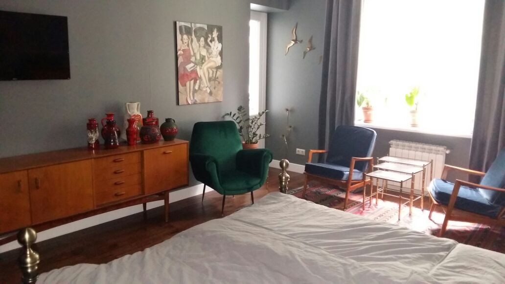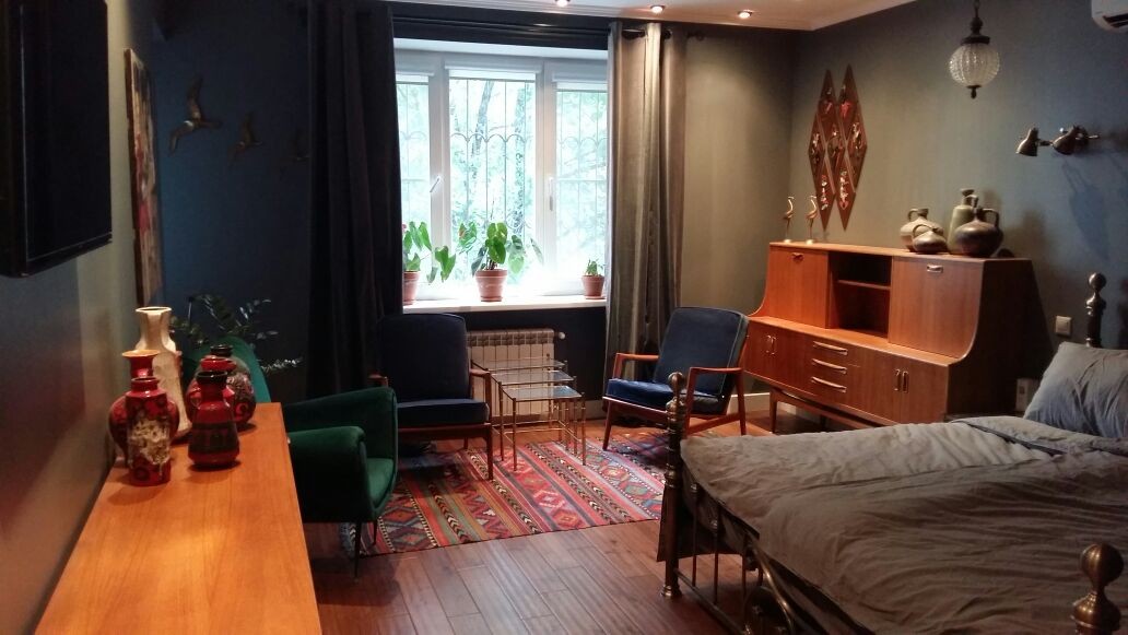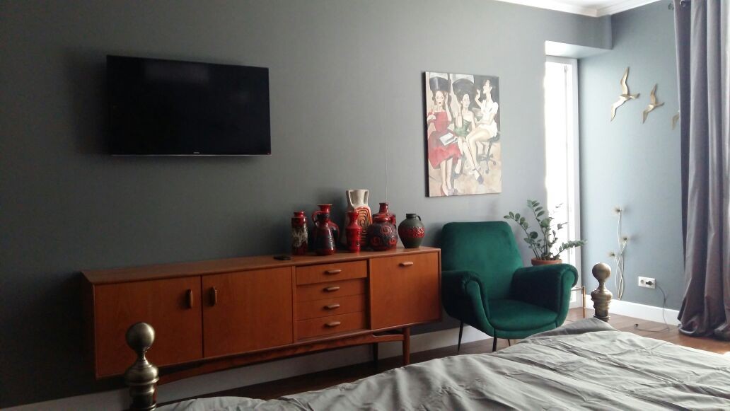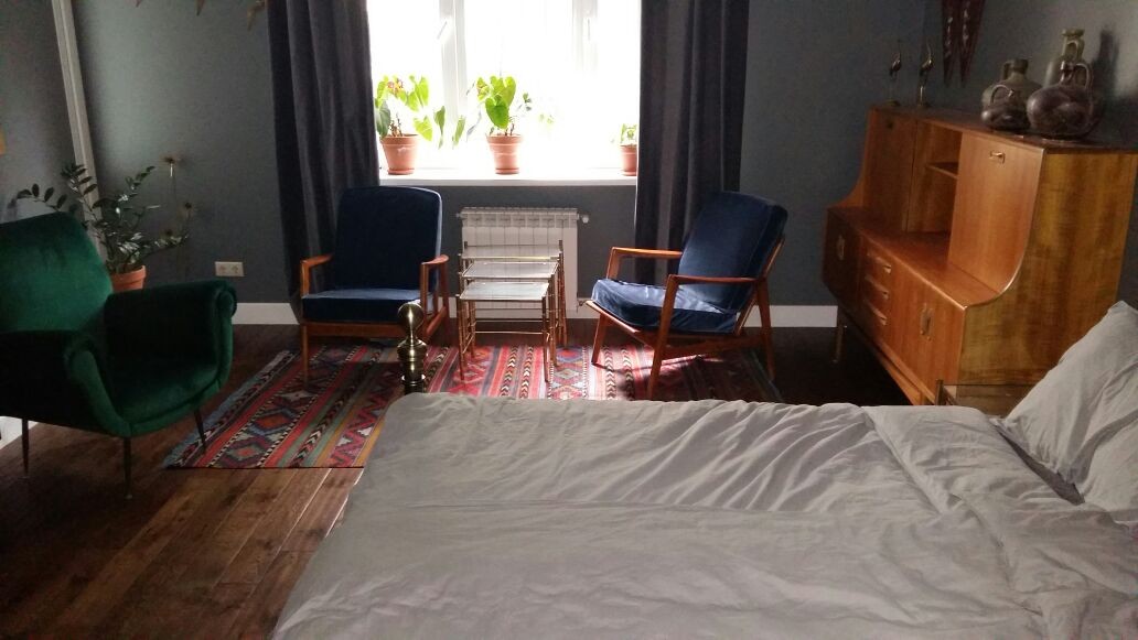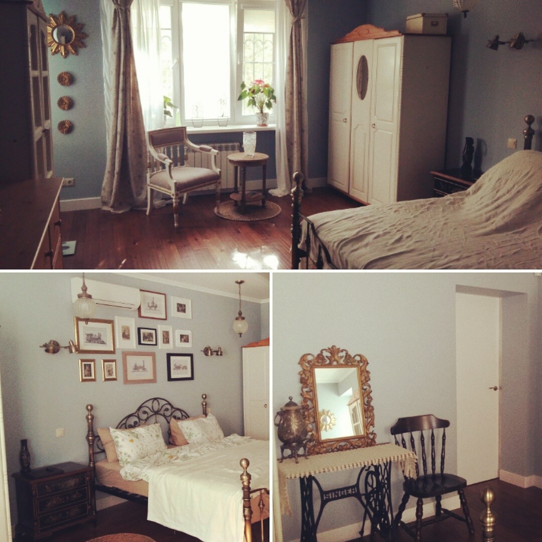 Моя страсть к винтажной мебели середины XX века не позволяла сделать быстрый ремонт. Пришлось погрузиться в долгий процесс поиска, ожидания и реставрации нужных предметов. В итоге комната преобразилась до неузнаваемости. От прежнего интерьера я оставила только кровать и потрясающие хрустальные подвесные светильники 60-х годов. Вся остальная мебель и декор отправились на временное хранение — они дожидаются переезда в загородный дом, где идеально впишутся в атмосферу дачной спальни.