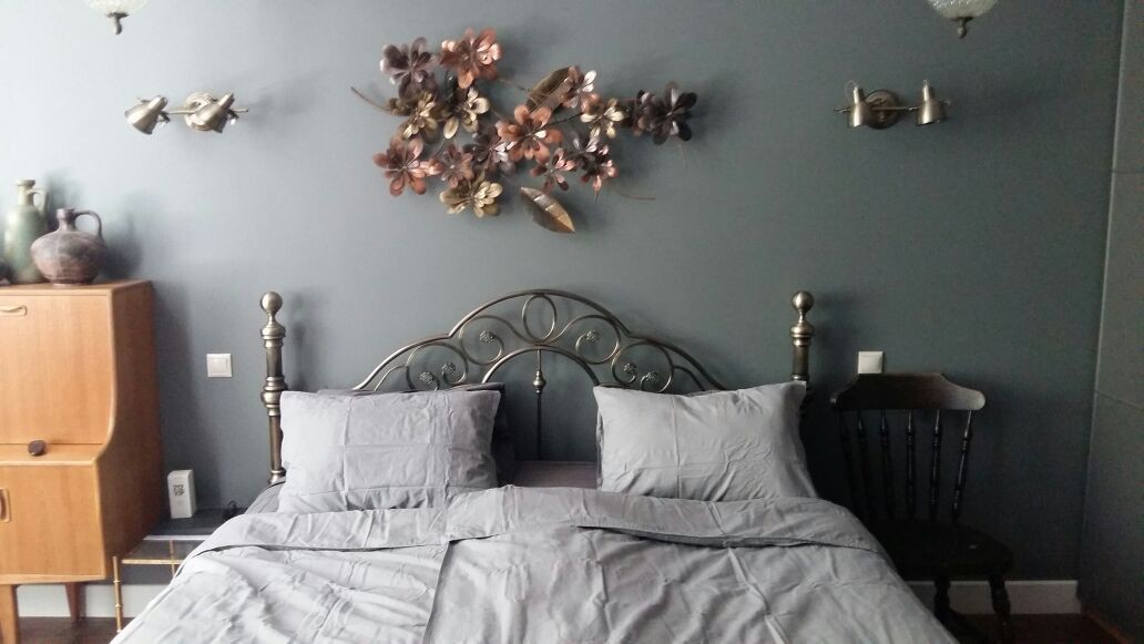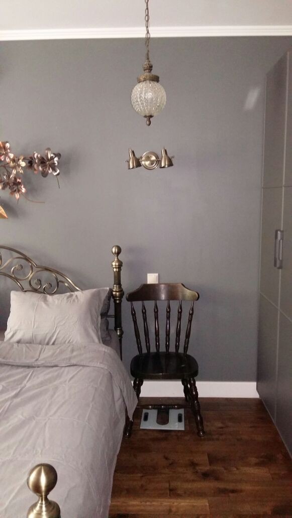 Теперь основа комнаты — это сложная игра темно-серых тонов. Стены, гардероб, шторы, карниз и постельное белье от ИКЕА выдержаны в этой гамме. Потолок — более светлого серого оттенка. На этом нейтральном фоне раскрывается коллекция винтажной мебели и декора, привезенных из Европы и Америки. Мягкая мебель была перетянута, а на полу теперь лежит табасаранский килим.