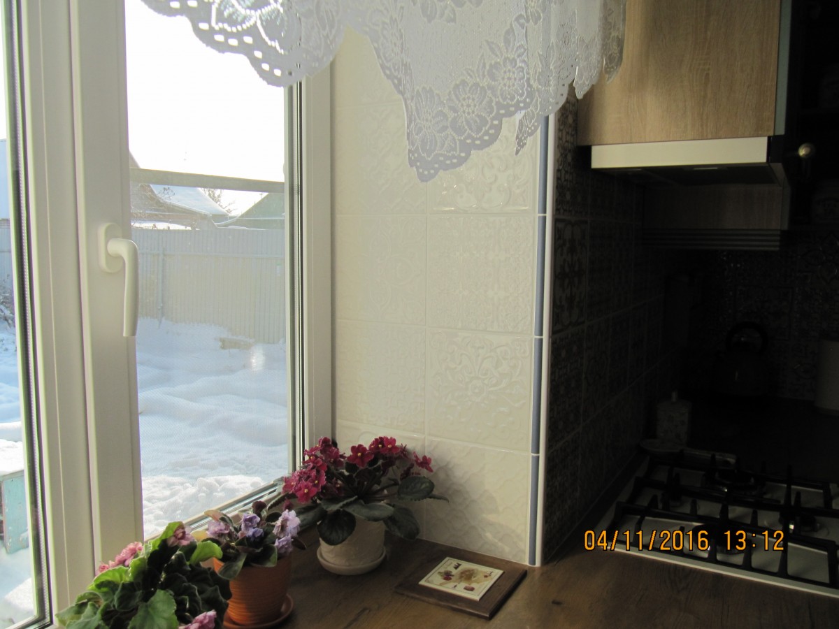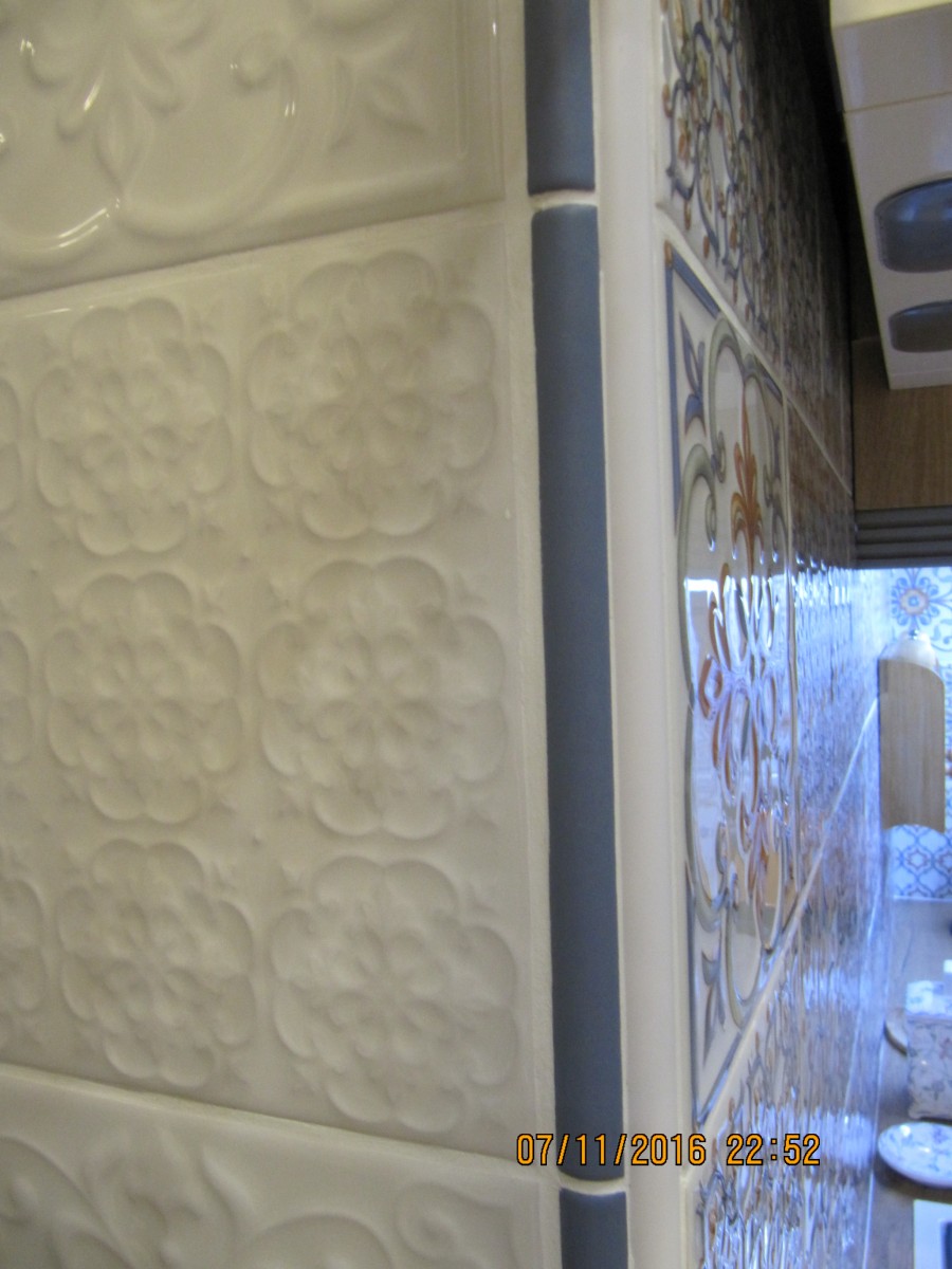 По просьбе одного из пользователей (horst) выкладываю фото того, как выполнено соединение стены и откоса. Мы использовали синий карандаш из коллекции «Сурей» и пластиковый уголок. В идеале, конечно, хотелось бы использовать специальный керамический уголок, но мы его не нашли. Это решение придумал и мастерски воплотил мой муж.