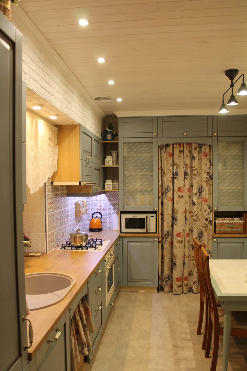 Вечером, при включенном свете, кухня преображается, становясь еще более уютной и теплой.