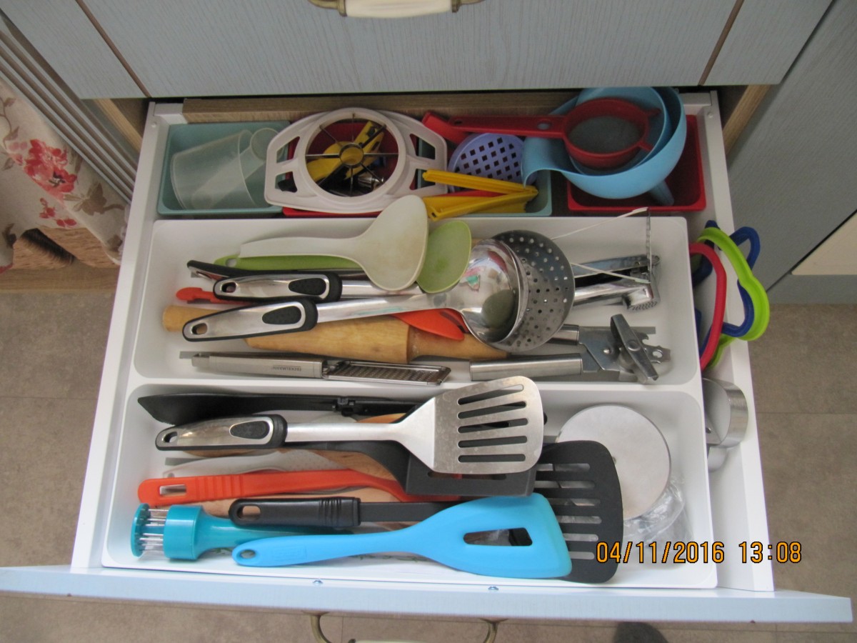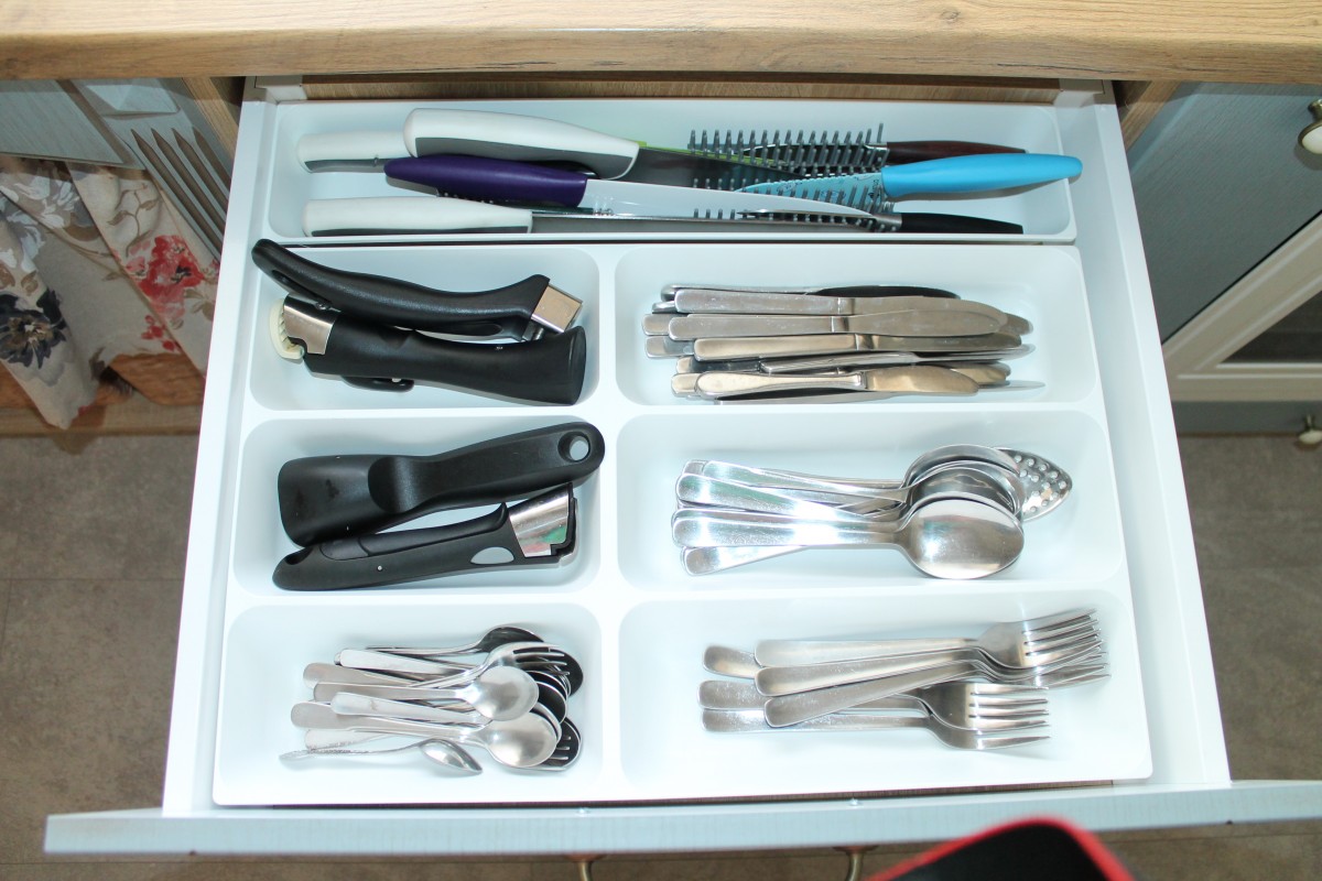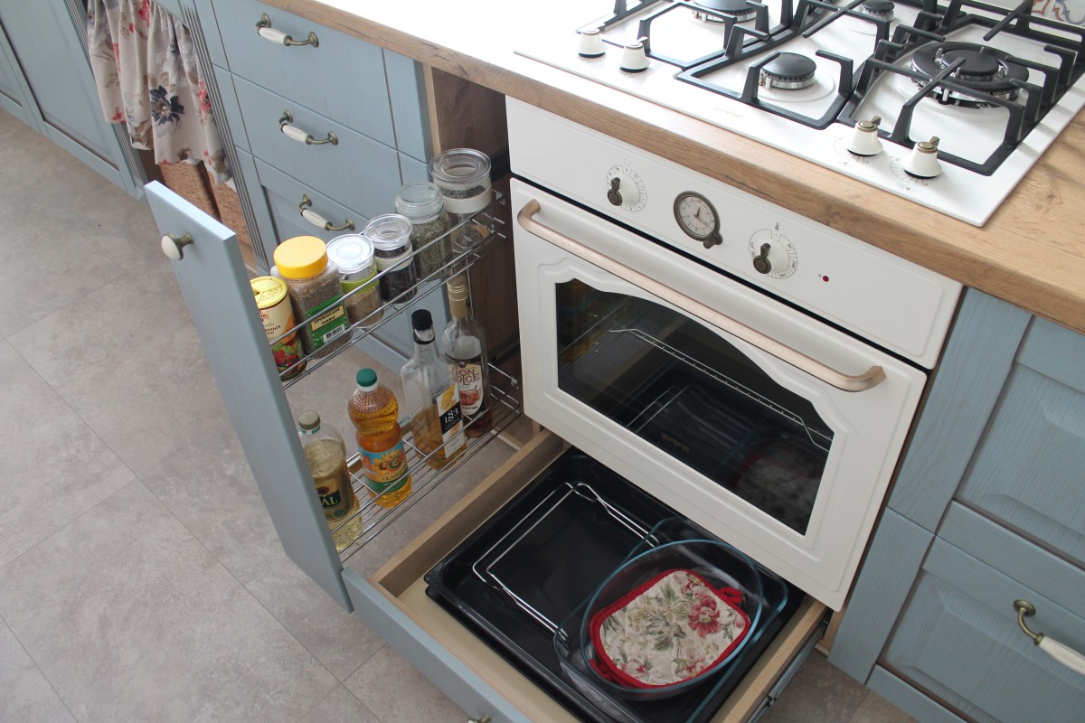 Внутреннее наполнение ящиков продумано до мелочей, чтобы на кухне всегда был порядок и все необходимое под рукой.