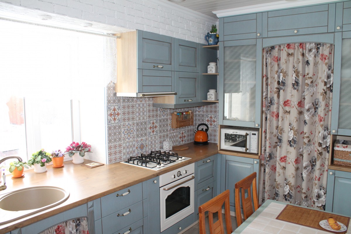Если присмотреться, на кухне можно заметить повторяющийся мотив — птички. Они украшают шторы, часы, кашпо и подсвечники, добавляя пространству легкую, жизнерадостную нотку.