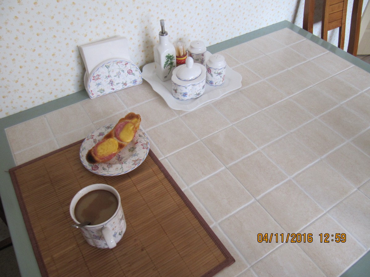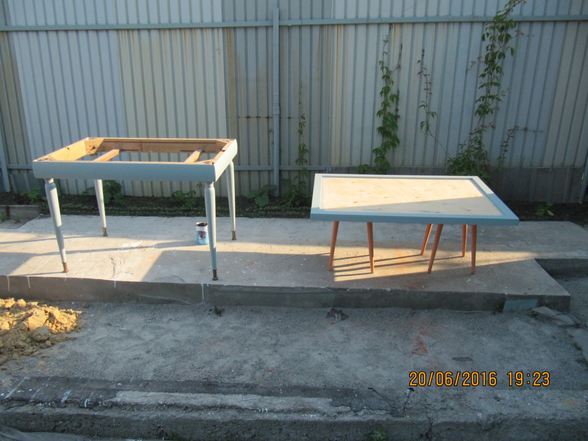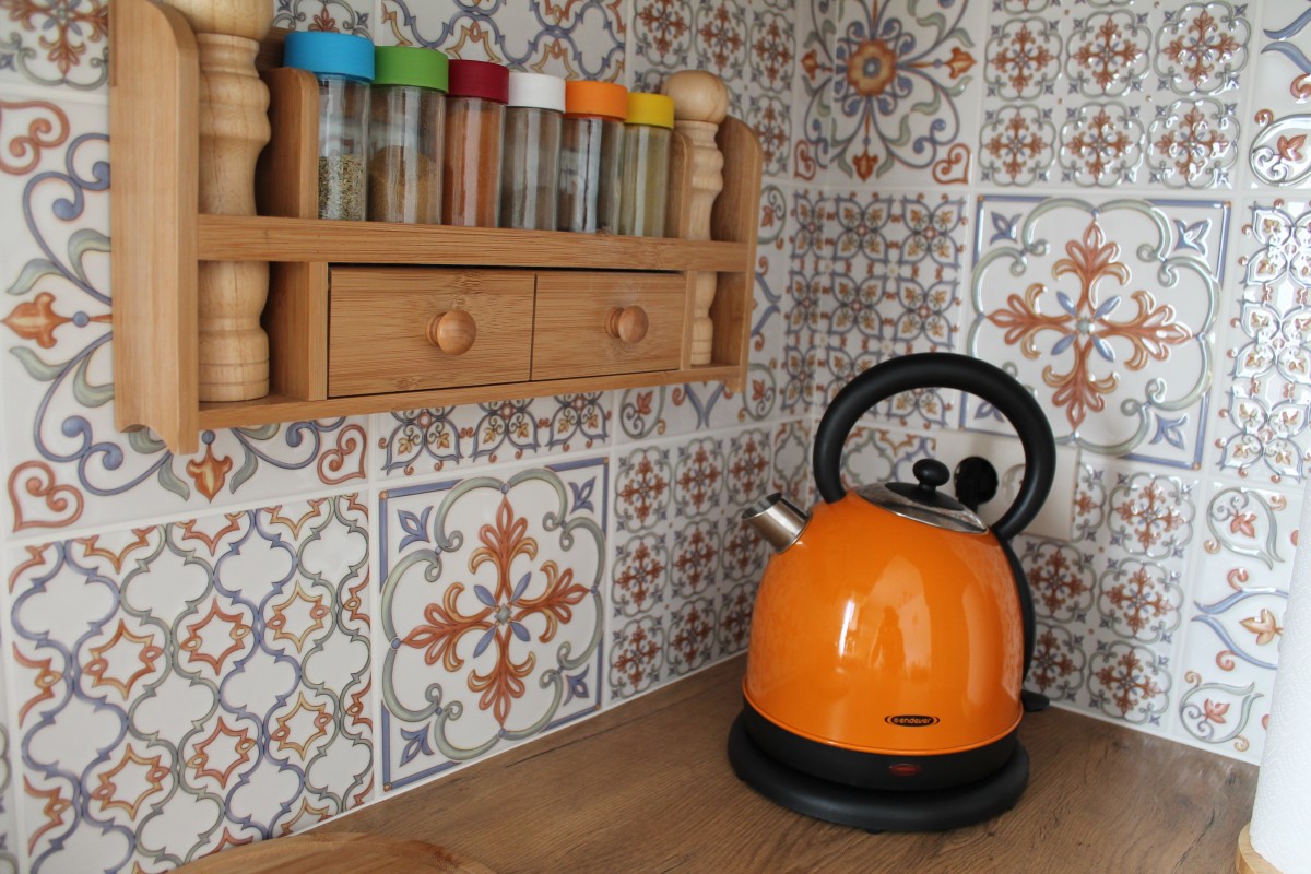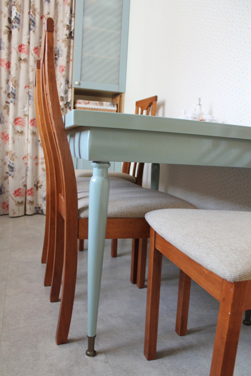 Обеденный стол — наша гордость. Мы сохранили красивые ножки от старого стола, а столешницу сделали из фанеры, облицевали кафелем и покрыли акриловой краской с яхтенным лаком для прочности. Пока это временное решение — стулья тоже от старого гарнитура, но в планах заменить их на новые, которые будут сочетаться со столешницей кухни.