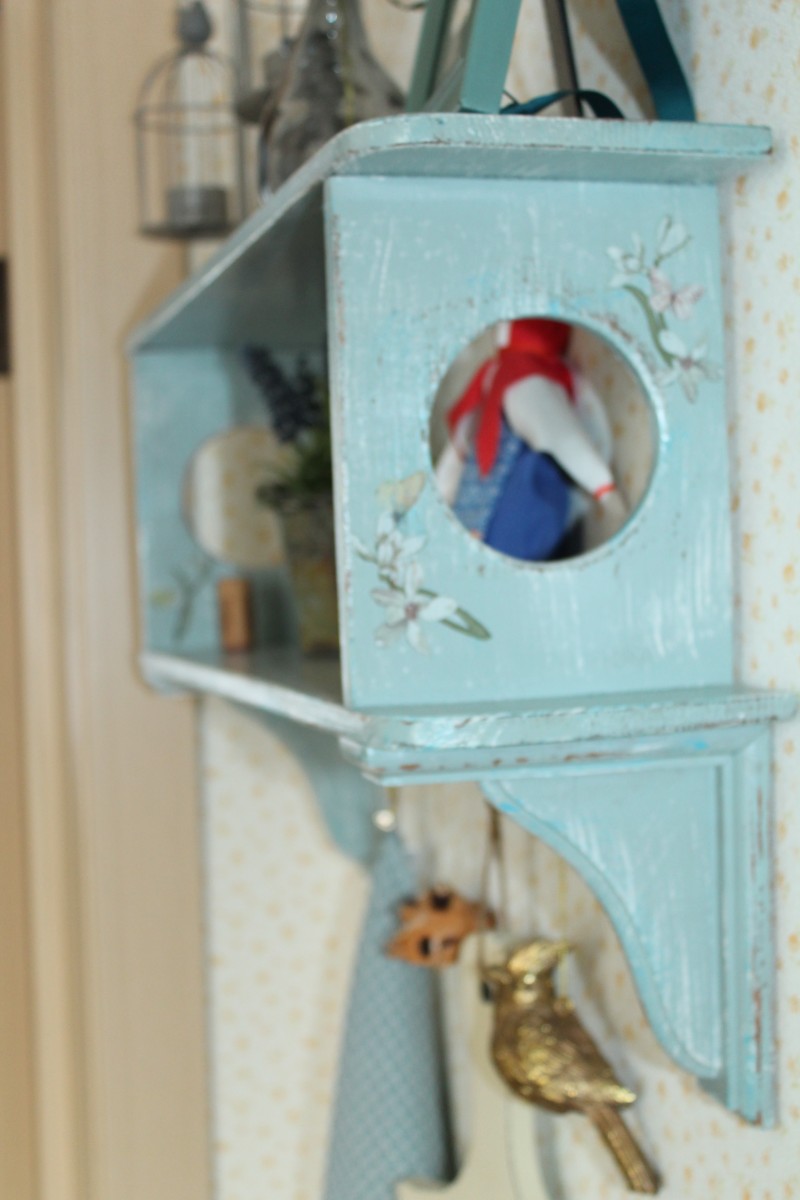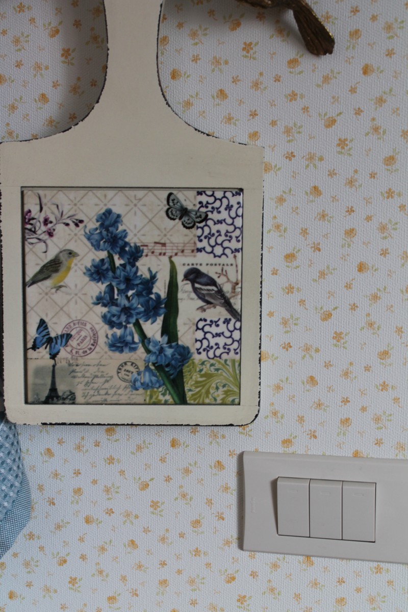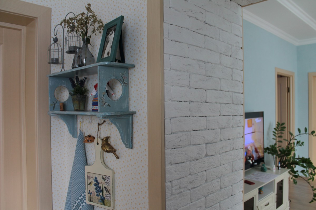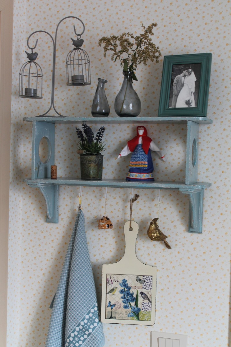 Еще один проект «сделай сам» — угловая полочка. Мы купили в «Леруа Мерлен» доску, готовые крючки и уголки. Конструкцию собрал муж, а я занималась декором: покрыла морилкой, натерла свечкой для эффекта состаривания, затем покрасила остатками акриловой краски от стола, добавила белые и синие акценты по углам, наклеила переводные картинки и закрепила все лаком. Муж завершил работу, прикрутив крючки.