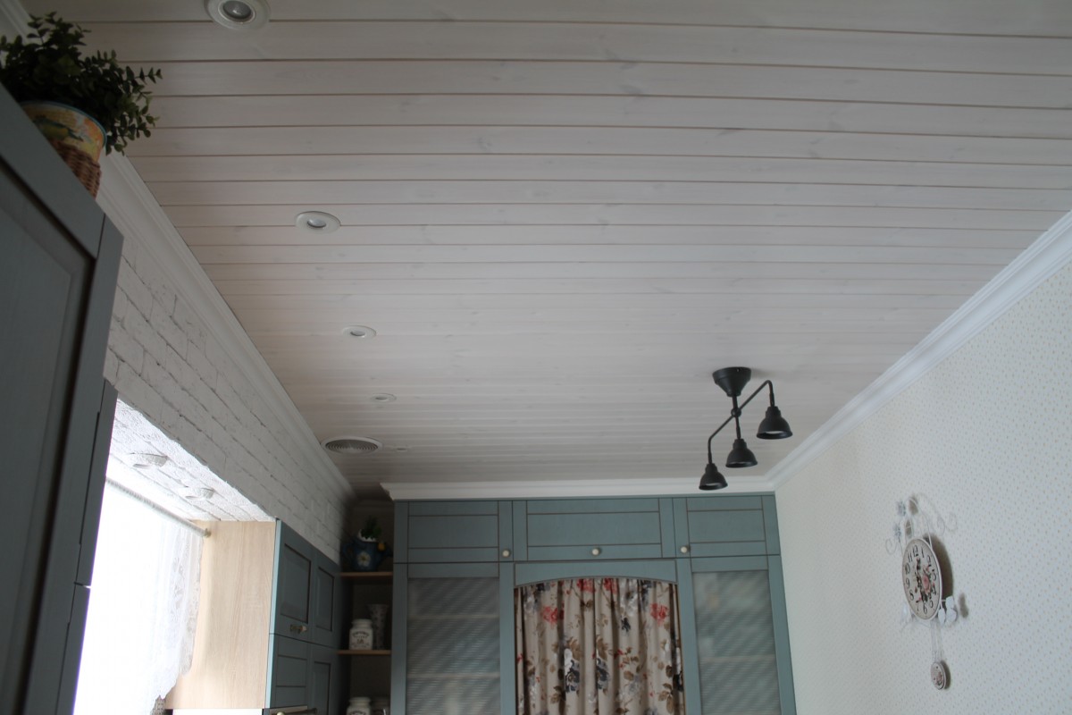 Потолок мы обшили вагонкой, которую покрасили специальным лакирующим составом. Он придает дереву белесый оттенок, но при этом сохраняет его натуральную текстуру. Каждую доску обрабатывали в два слоя до монтажа на потолок.