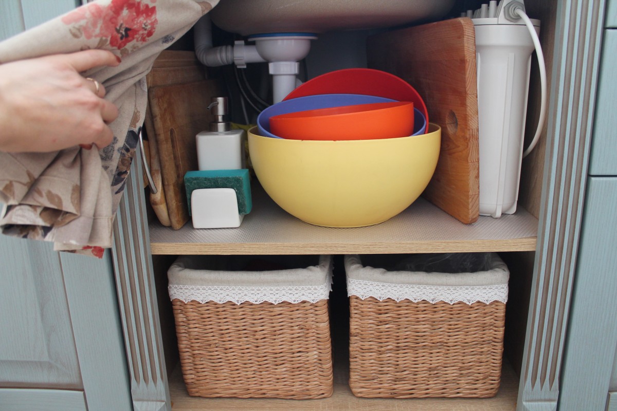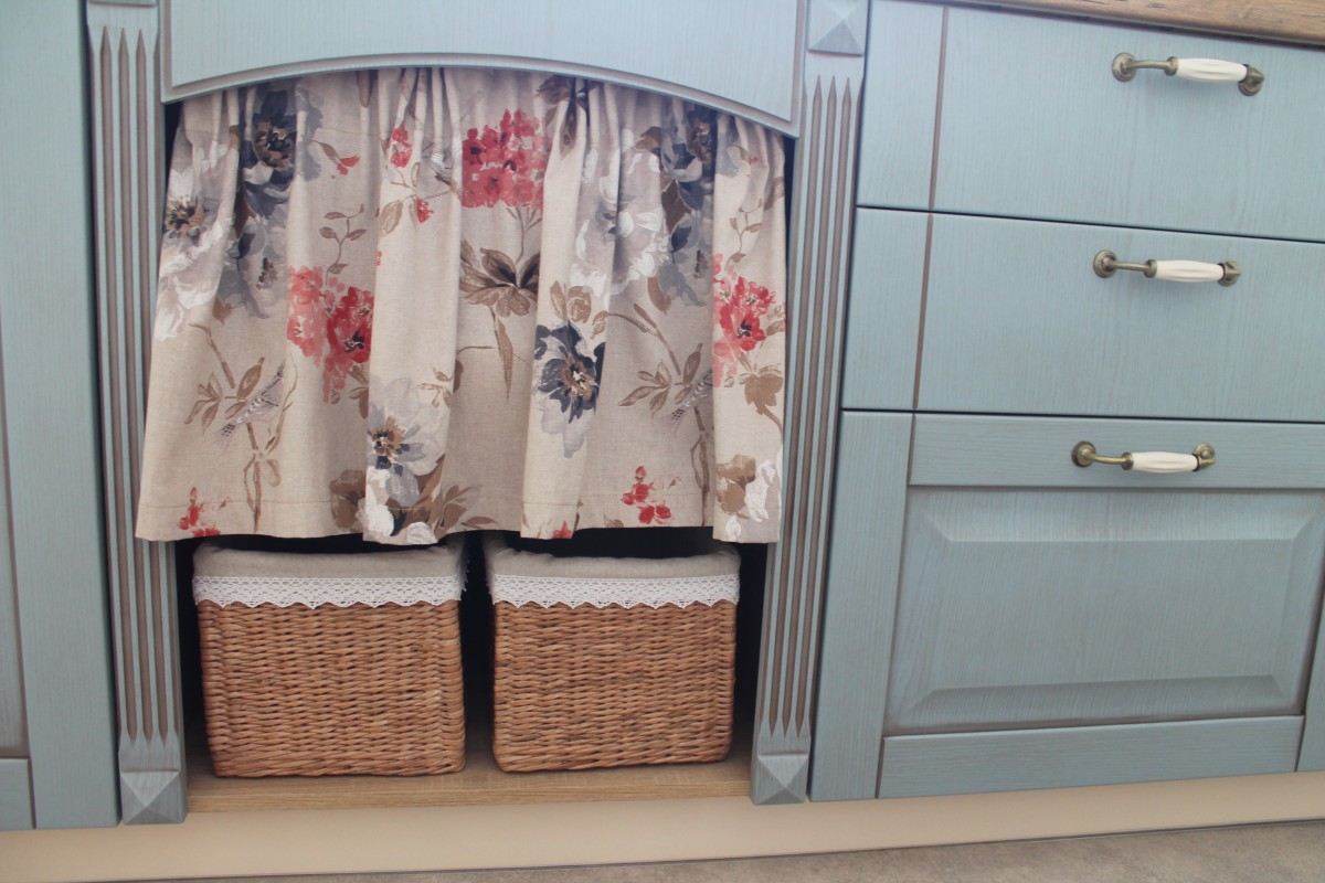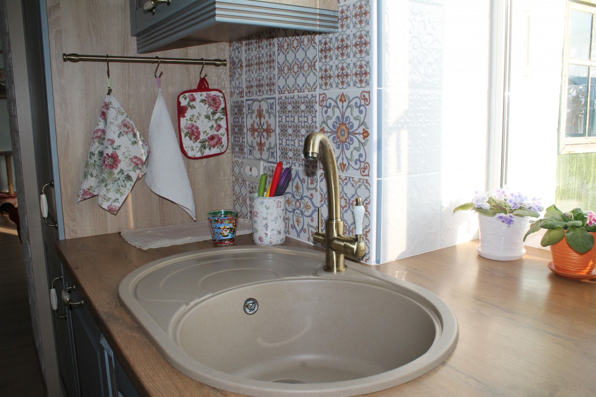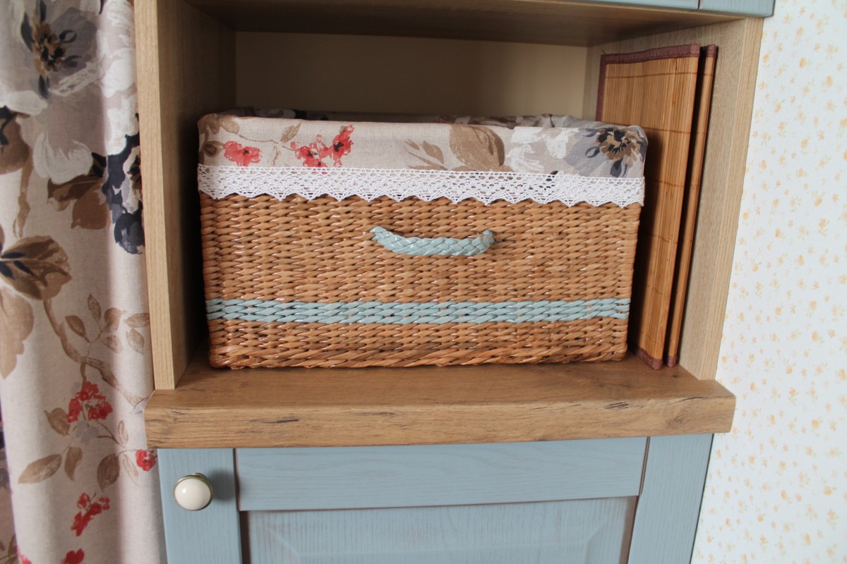 Обычные горшочки из Икеи я немного доработала, чтобы они лучше вписались в интерьер. А под раковиной организовано удобное хранение для разделочных досок, мисок, фильтра для воды и моющих средств. Особую гордость вызывают хлебница и корзинки, которые я сплела сама из бумажных трубочек — это и экологично, и очень душевно.