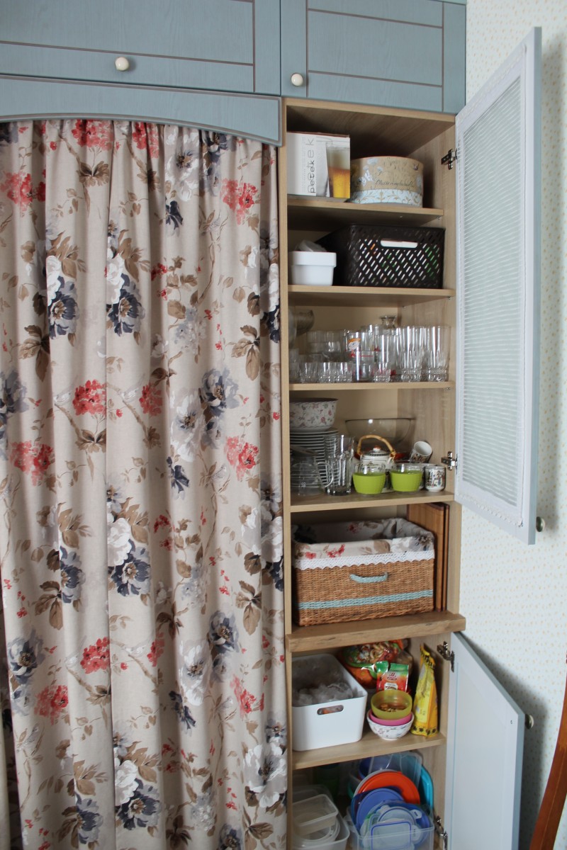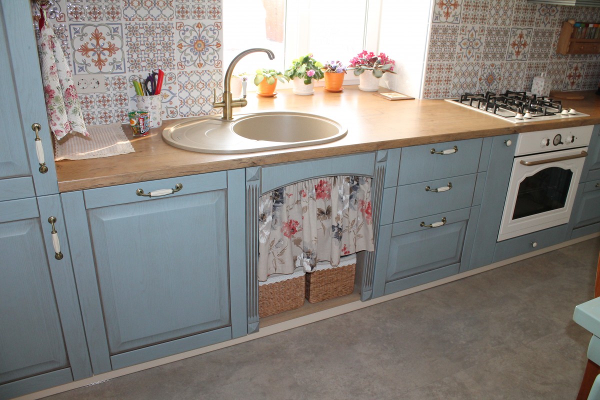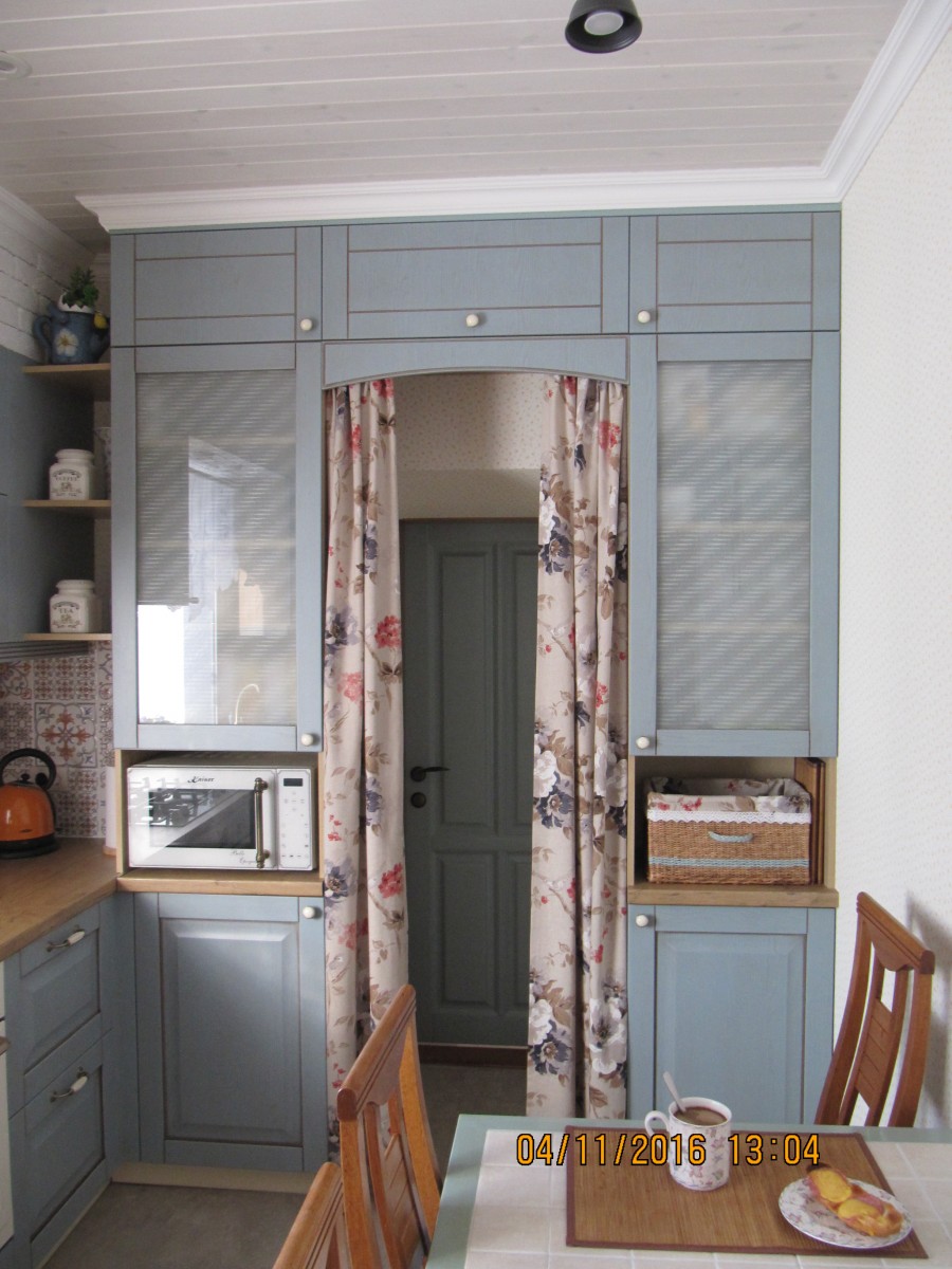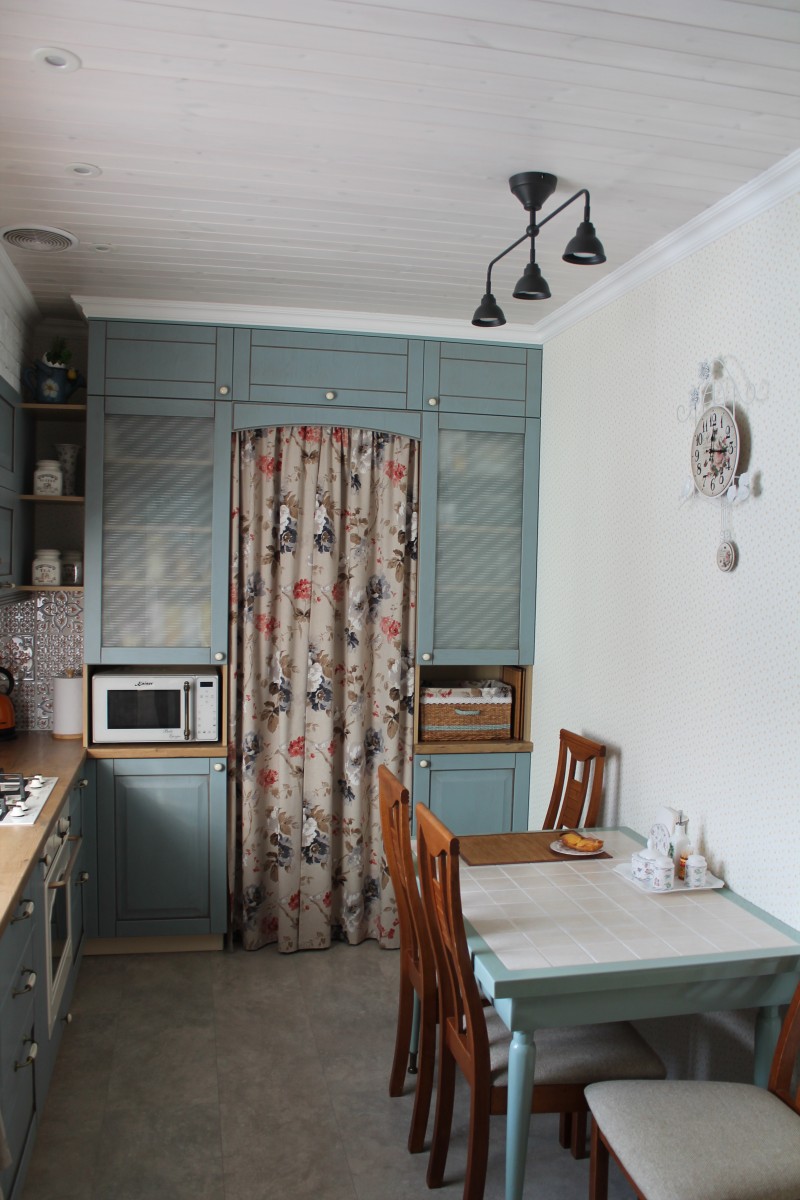 Особую атмосферу создают детали, многие из которых мы сделали сами. Например, дверь в хозяйственную комнату. Мы покрасили ее акриловой краской, заколерованной точно в цвет кухонных фасадов, а для защиты покрыли лаком на водной основе. Этой же краской обновлен стол и угловая полочка.