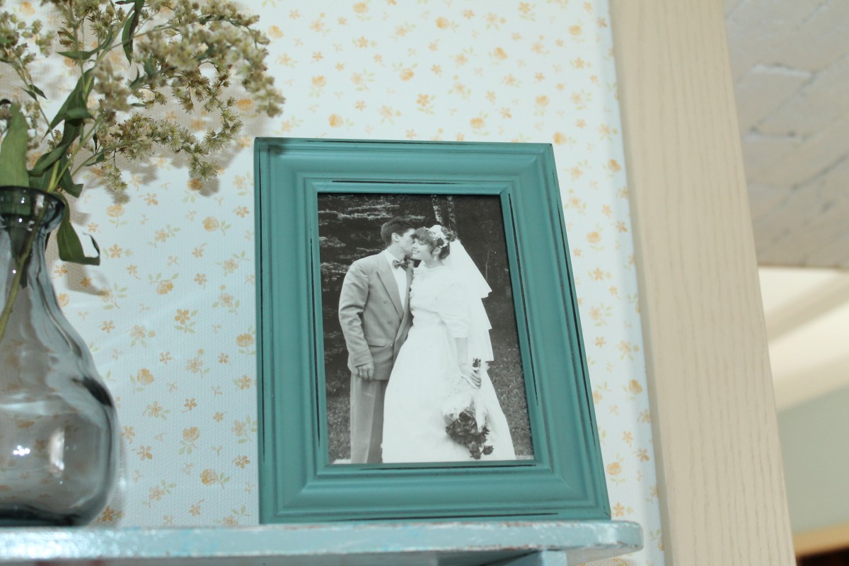 На полочке и в других уголках кухни живут милые воспоминания — например, фото нас, молодых и влюбленных.