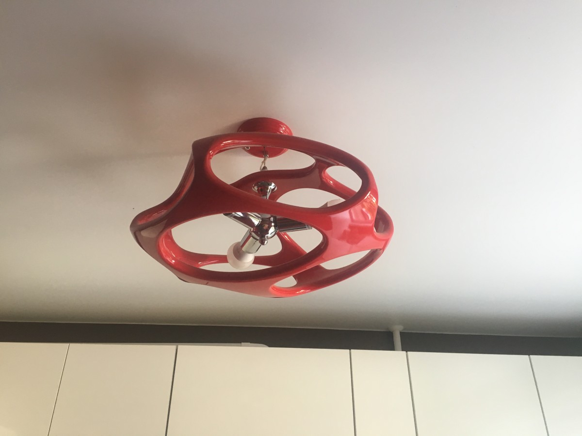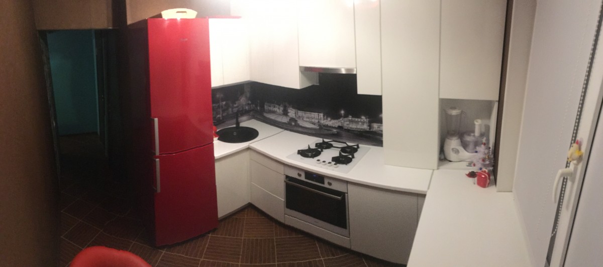 Панорамный вид раскрывает главные черты моего интерьера: страсть к красным акцентам и минимализм без лишних деталей. Шкафы без ручек — отличное решение для тех, кто ценит лаконичность и не любит лишний раз мыть поверхности. А еще они очень приятно и тихо закрываются.