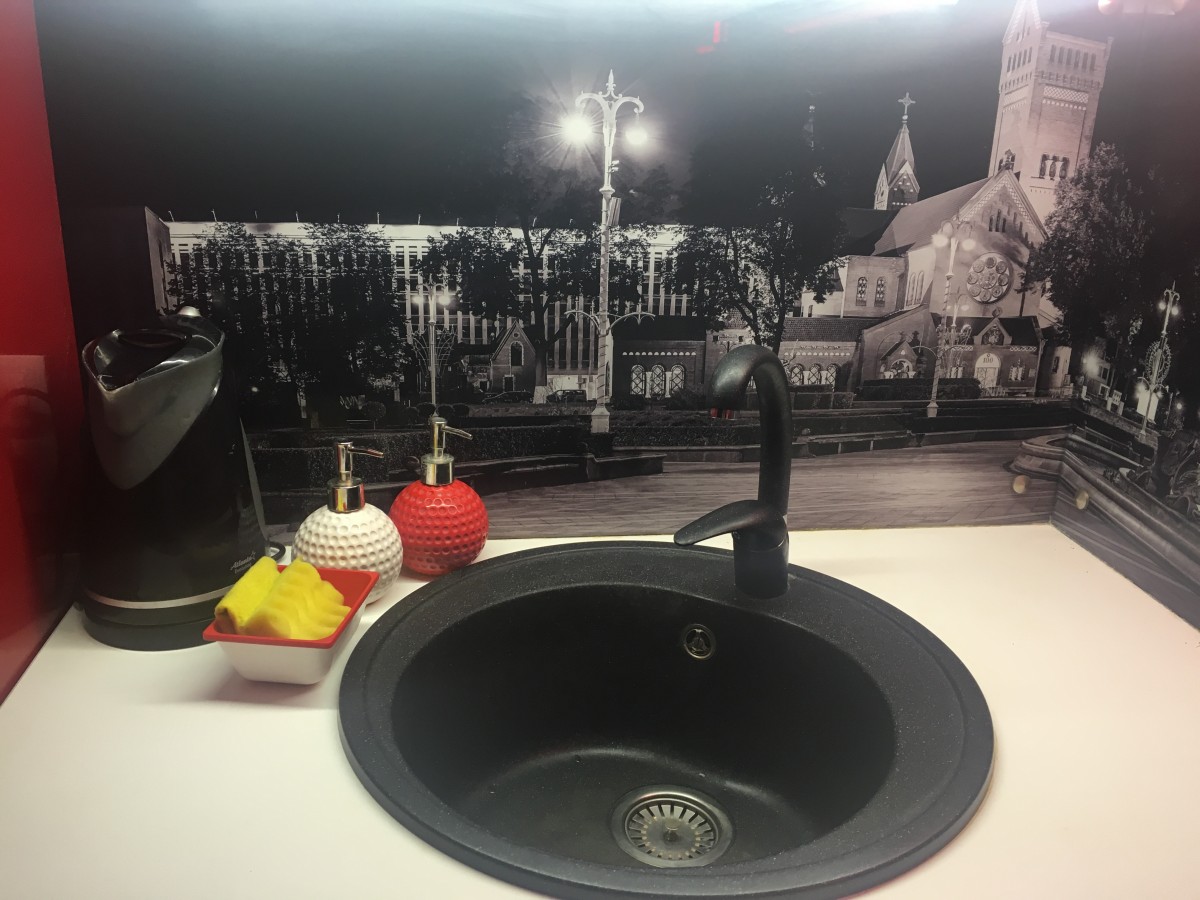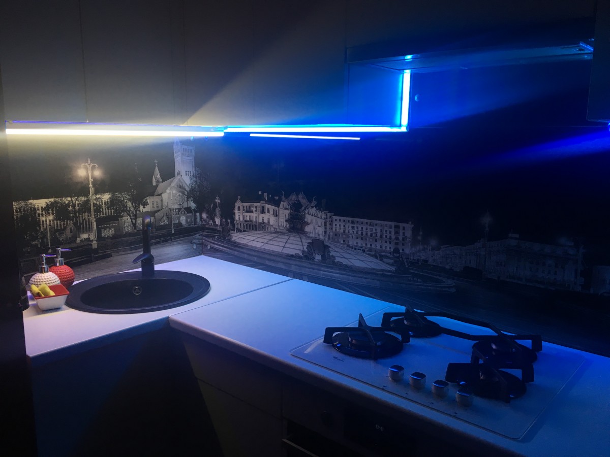 Освещение продумано тщательно: над мойкой установлена лампа дневного света для комфортной работы, а по периметру потолка пущена разноцветная светодиодная лента для создания настроения. А теперь — несколько деталей крупным планом.
