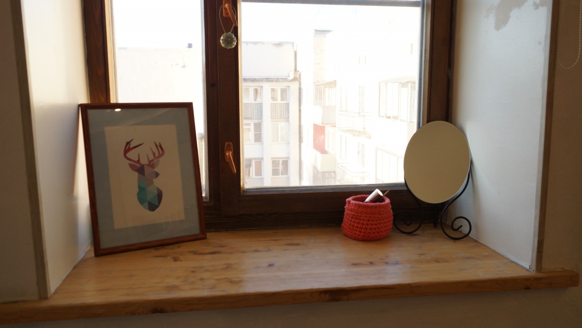 Подоконник пока в таком виде. Не убрала прихват для шторы — он, кстати, тоже иногда служит игрушкой.