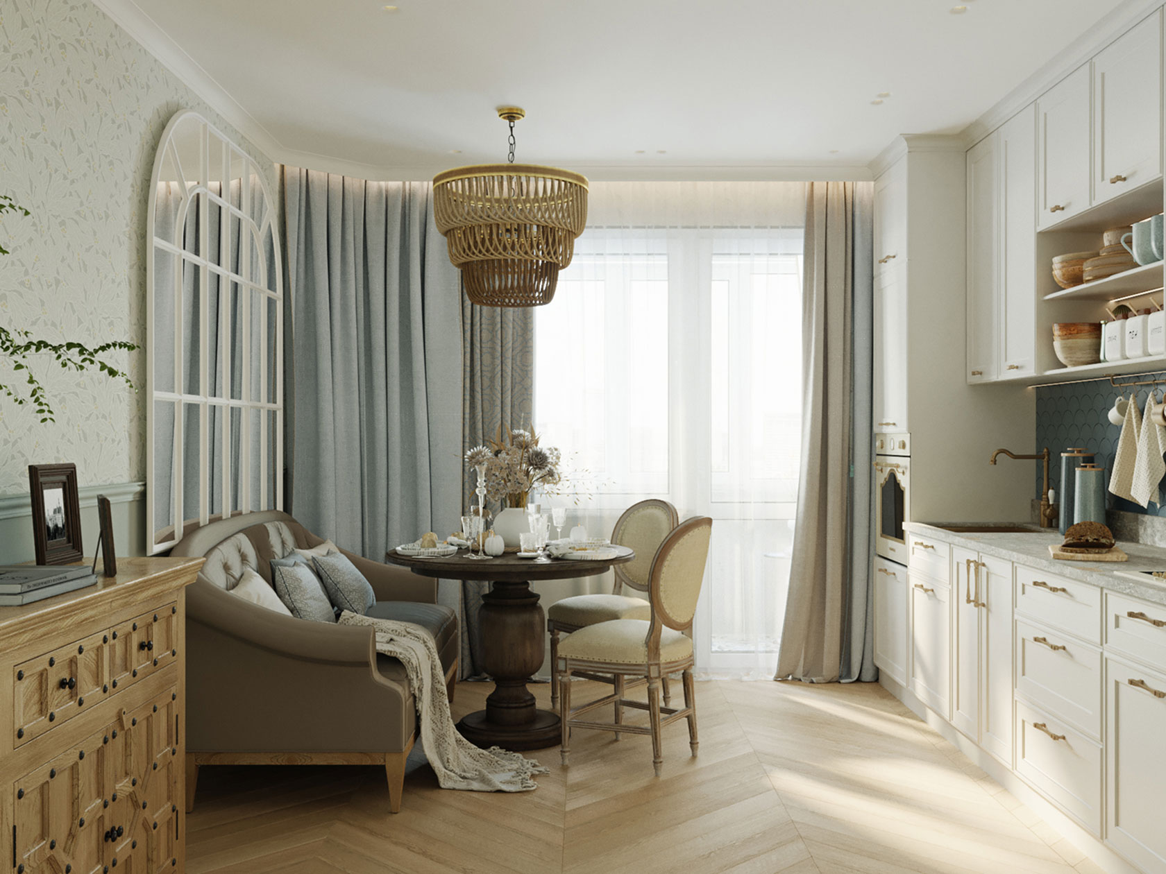 Цветовая гамма: Нежная, пастельная палитра с акцентами натурального дерева и текстиля.