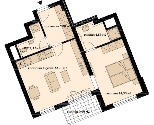 Из прихожей ведут двери в санузел, где предусмотрена ниша для стиральной машины, и в гостиную. Пространство гостиной, совмещенной с кухней и столовой, составляет 25 квадратных метров (5х5 м). Отсюда раздвижная дверь ведет в спальню, которая имеет прямой выход в ванную комнату.