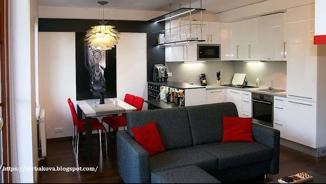 Невозможно не заметить большую барную стойку, под столешницей которой удобно размещается коллекция бокалов и стаканов. Рядом с раскладным обеденным столом расположена винотека и скрытый бар с зеркалом и светодиодной подсветкой. Дизайнерская люстра и крупноформатная фотография Стамбула дополняют лаконичную мебель.