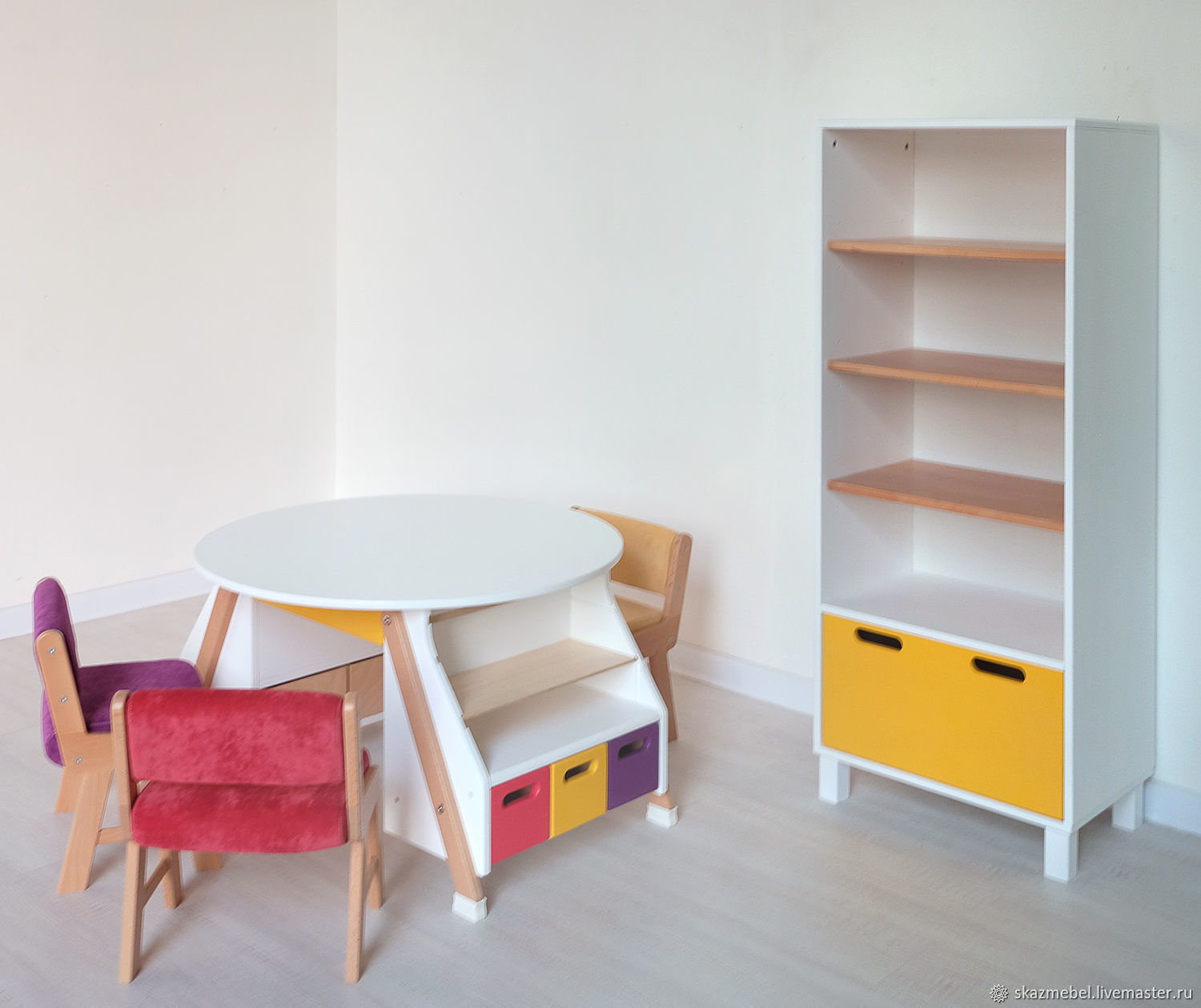 Стол и стулья являются очень важной частью детской комнаты. За ним ребенок будет кушать, рисовать, играть, а может даже и принимать гостей! Для этих целей подойдет небольшой столик с несколькими стульчиками, которые должны быть легкими, но прочными, что-бы малыш в будущем мог сам их перемещать по надобности.