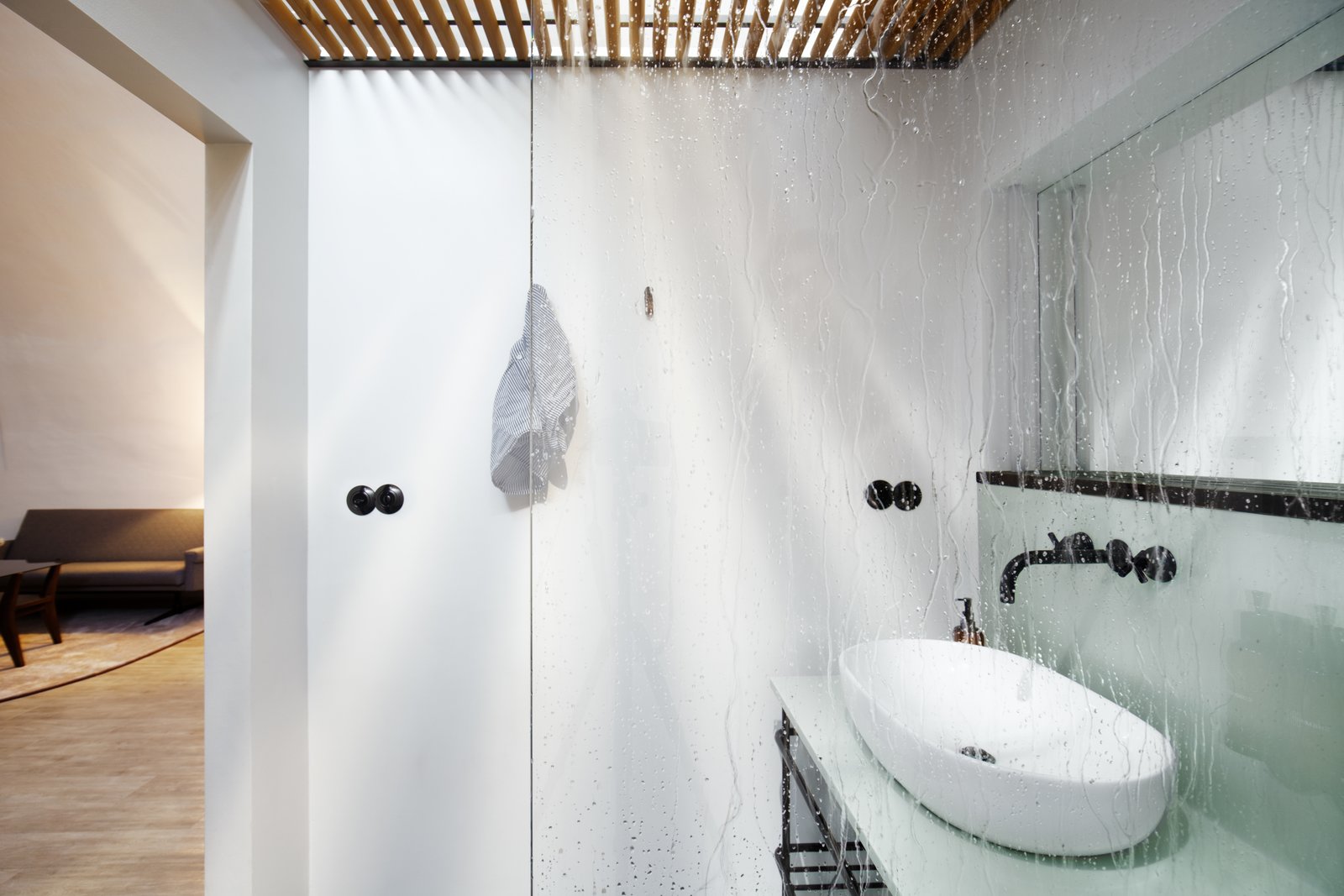Основой дизайнерской концепции стали светлые, почти белоснежные пространства, дополненные мягкой нейтральной палитрой и выразительными черными акцентами. Такой подход создает ощущение простора, чистоты и современной элегантности. Особую ценность интерьеру придает эксклюзивная мебель: кровати, зеркала, светильники, полки и даже элементы сантехники были изготовлены на заказ местными мастерами, что подчеркивает связь с регионом и добавляет аутентичности.
