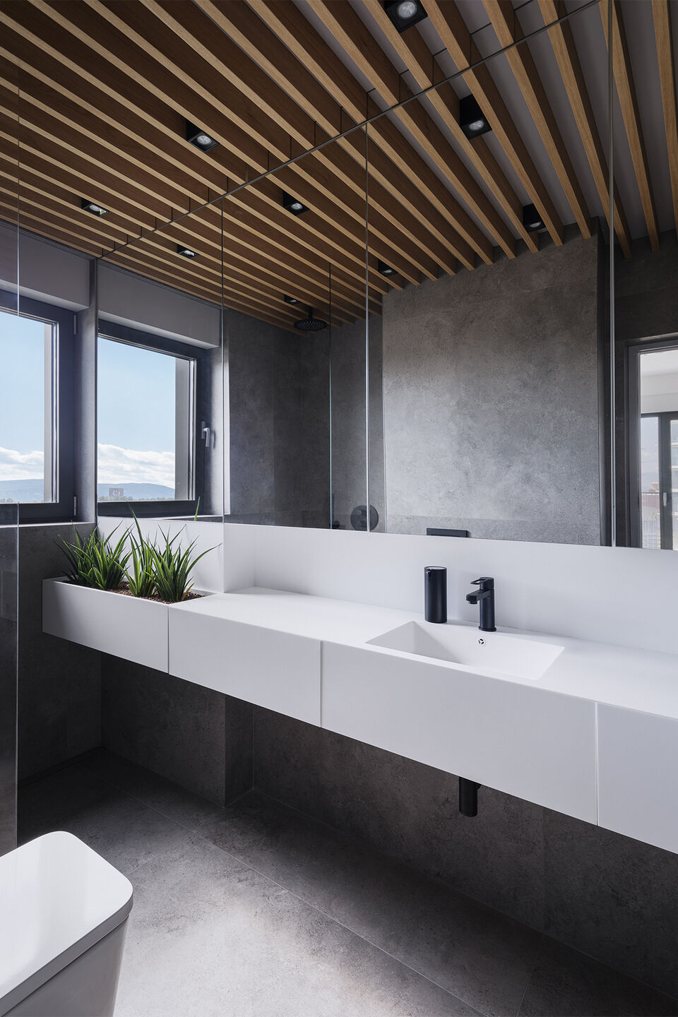 Такая же серая обшивка, как и на кухне, скрывает потайную дверь в ванную комнату.