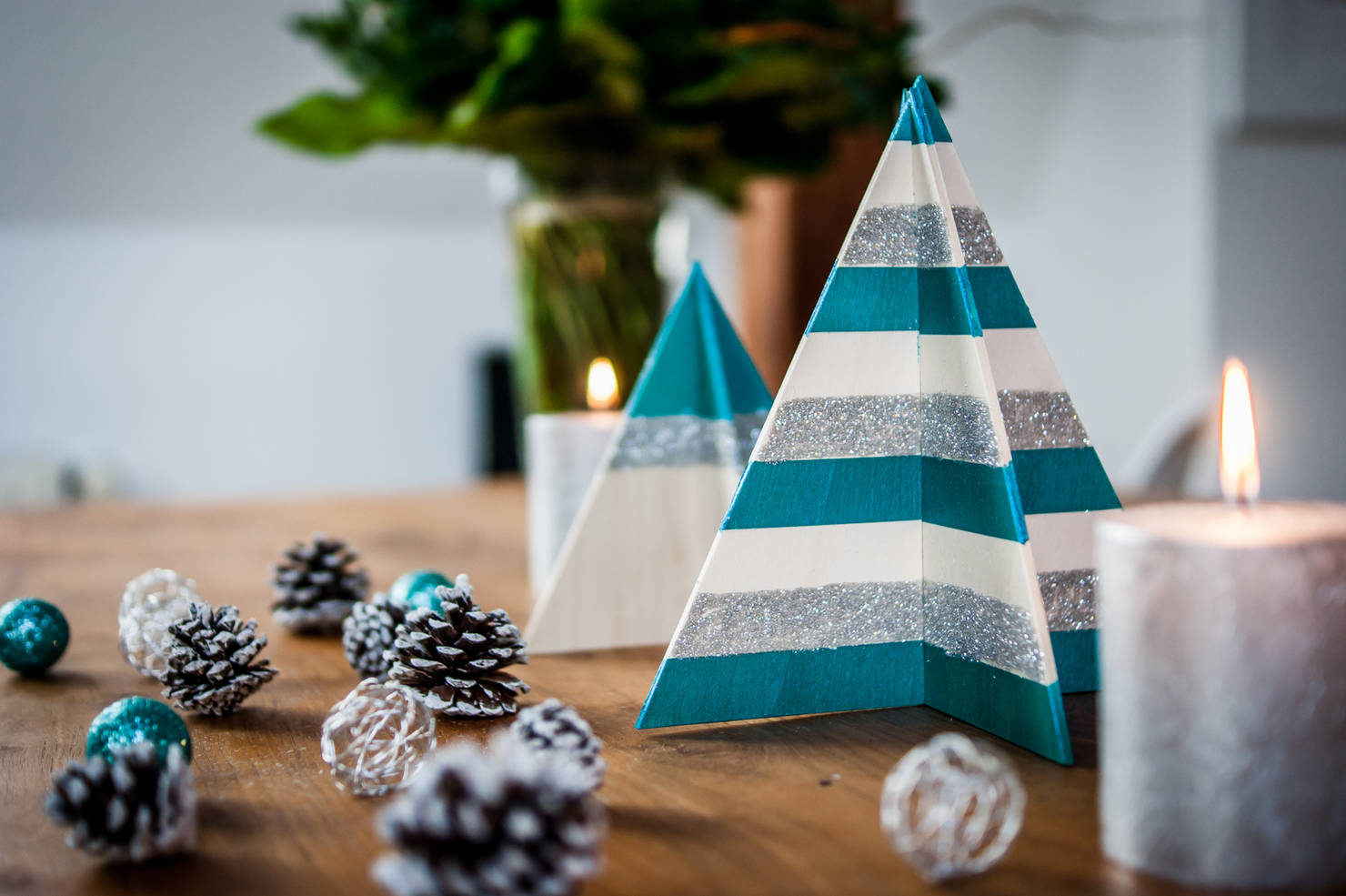 Обычные сосновые шишки, покрытые серебристой или белой краской, становятся элегантным декором. Их можно разложить в вазах, на столе или использовать для создания венков.