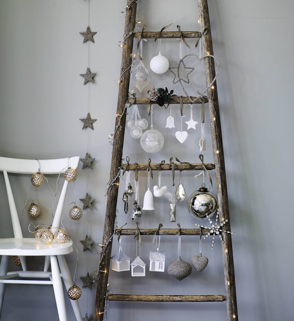 Небольшая деревянная лестница, украшенная гирляндами и несколькими шарами в скандинавской палитре, превращается в стильную вертикальную инсталляцию. Она экономит место и выглядит очень оригинально.