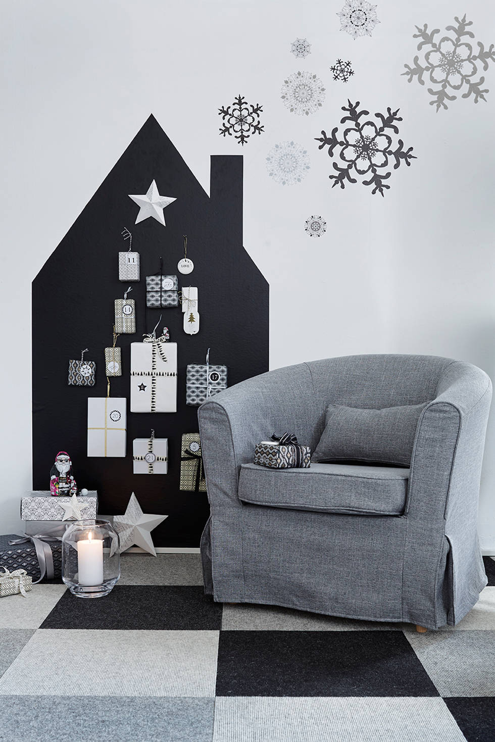 Виниловые наклейки с оленями, снежинками или надписями — быстрый и эффектный способ преобразить пространство. Их легко наклеить и снять после праздников, не оставив следов.
