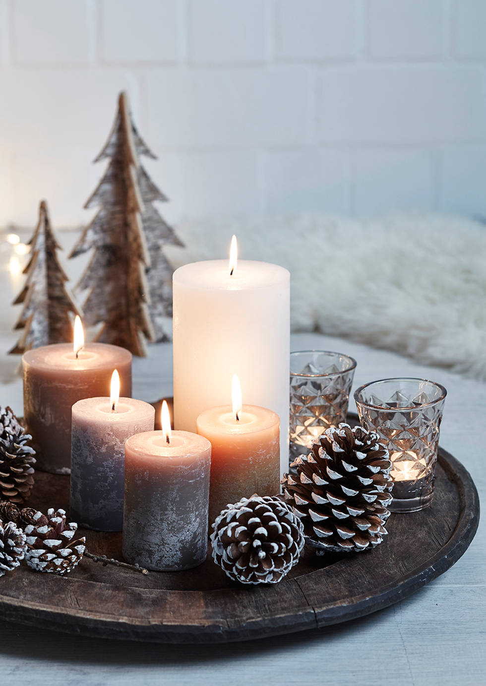 Простые стеклянные стаканы или банки, наполненные шишками, веточками и свечой, создают мягкое, уютное освещение. Это один из самых доступных и эффектных приёмов скандинавского декора.