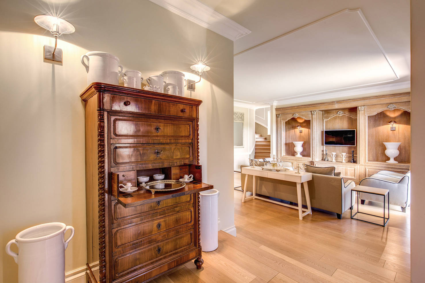 При входе в дом гостей встречает элегантная прихожая, задающая тон всему интерьеру. Особого внимания заслуживают изящные молдинги, которые плавно соединяют стены с потолком, добавляя помещению архитектурной выразительности. Благодаря открытой планировке, из прихожей открывается вид на просторную гостиную, что визуально расширяет пространство и создает ощущение простора.