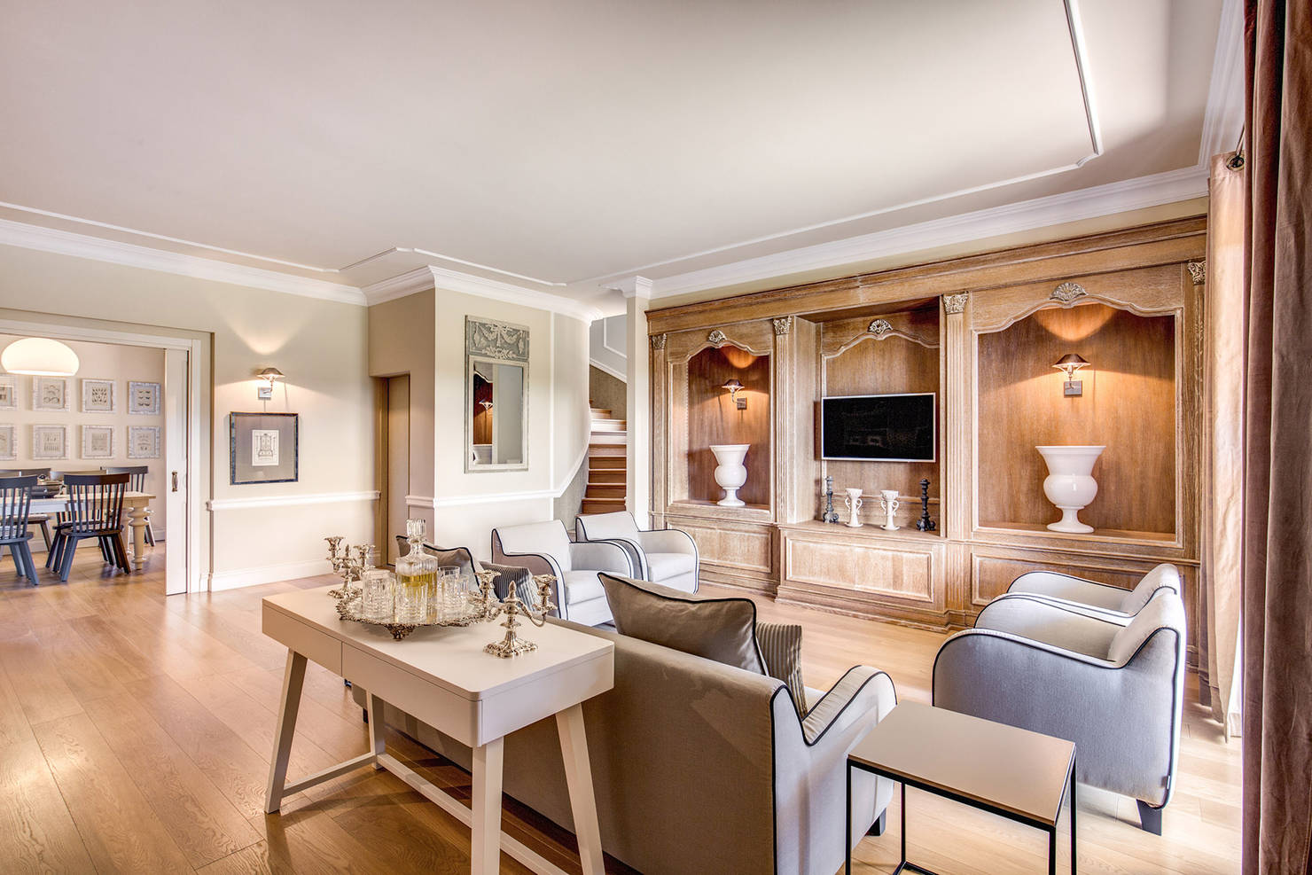 Гостиная воплощает в себе элегантность и безупречный вкус. Современная мебель тщательно подобрана и идеально вписывается в габариты комнаты. Одна из стен украшена встроенными нишами с мебелью из светлого дерева, что обеспечивает функциональность, не перегружая интерьер. Дизайн пространства логично подводит взгляд к лестнице, ведущей на второй этаж, поддерживая целостность и flow всего дома.
