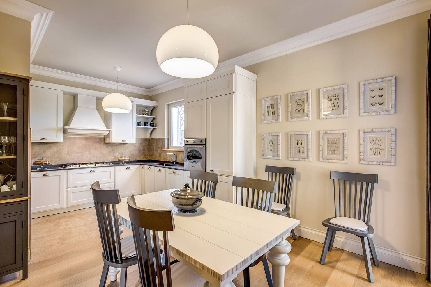 Столовая объединена с кухней, следуя традиции старинных загородных домов, где эти зоны были единым целым. Кухня отличается высокой функциональностью и продуманной эргономикой. Столовая естественным образом интегрирована в общее пространство, создавая идеальное место для семейных обедов и приема гостей. Яркие картины на стене добавляют живости интерьеру, а современные светильники вносят актуальный дизайнерский акцент.
