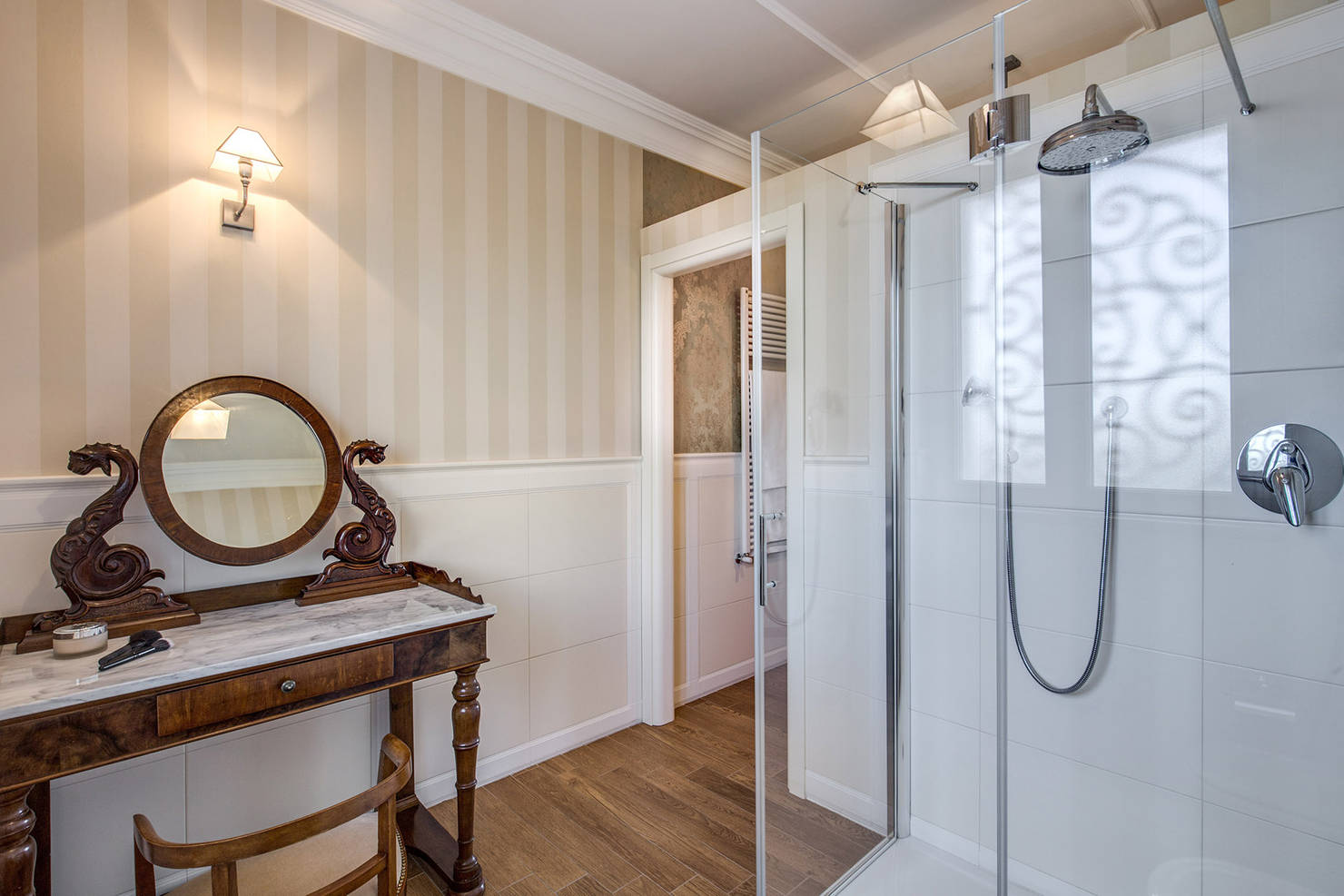 Главная ванная комната мастерски сочетает классические мотивы с современными решениями. В вестибюле, где расположена раковина, соседствуют изящный туалетный столик и contemporary душевая зона. Дверь из закаленного стекла с элегантной отделкой добавляет помещению легкости и визуальной прозрачности.