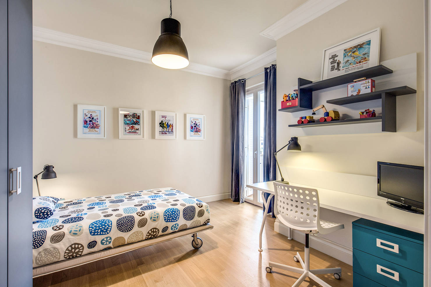 Вторая спальня продолжает тему современного дизайна, что проявляется в выборе мебели и светильников. Просторное помещение организовано практично и удобно: здесь нашлось место не только для кровати, но и для рабочего стола, что делает комнату multifunctional.