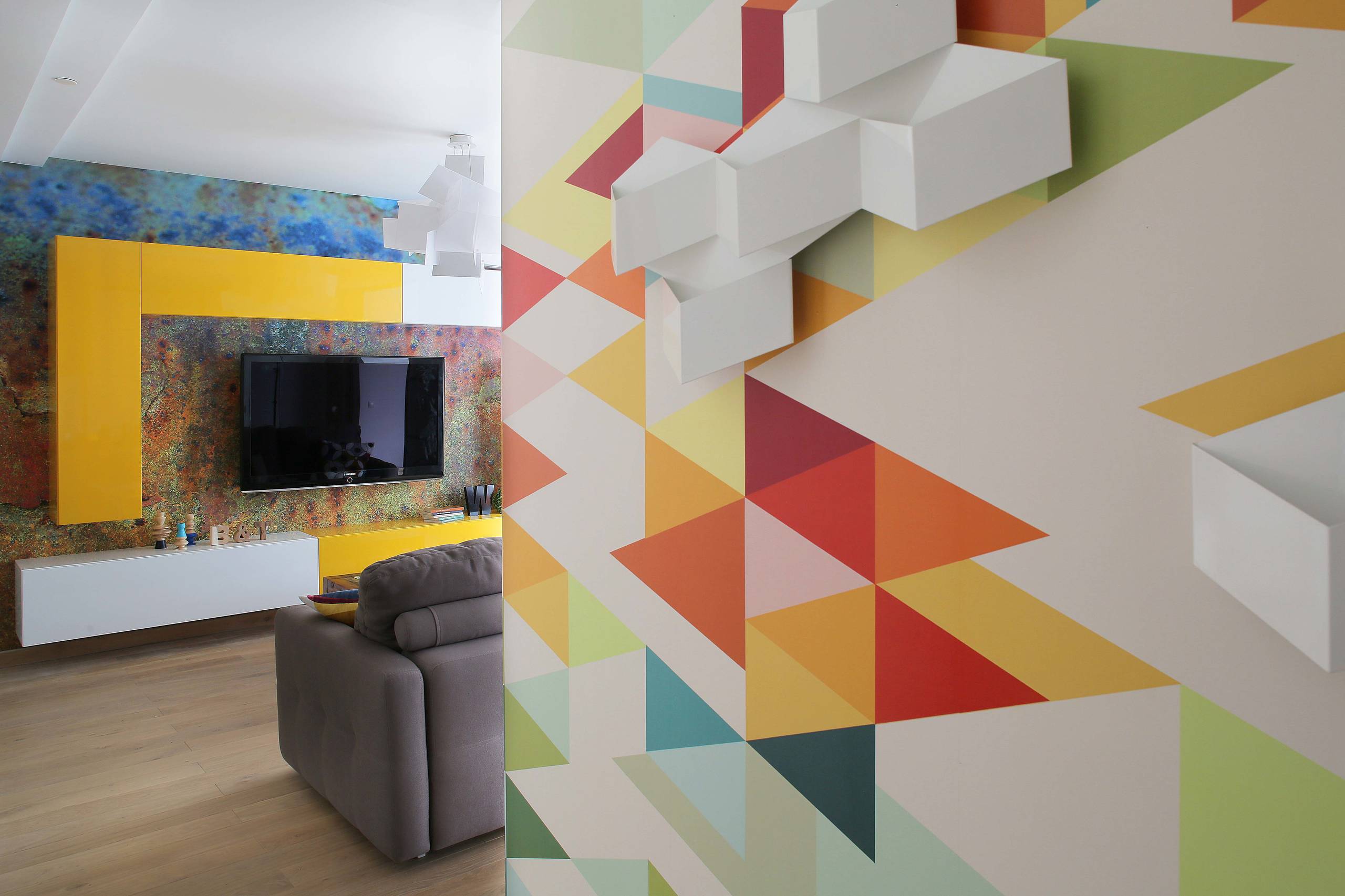 Абстрактное панно в гостиной, с его сложными цветовыми переходами, создаёт удивительную игру света, которая перекликается с вечерней иллюминацией за окном. Яркие акценты рассыпаны по всему пространству: в полихромной столешнице журнального столика, в пёстрых диванных подушках, в мозаичных настенных часах и даже в разноцветном плиточном полу на кухне и в прихожей.