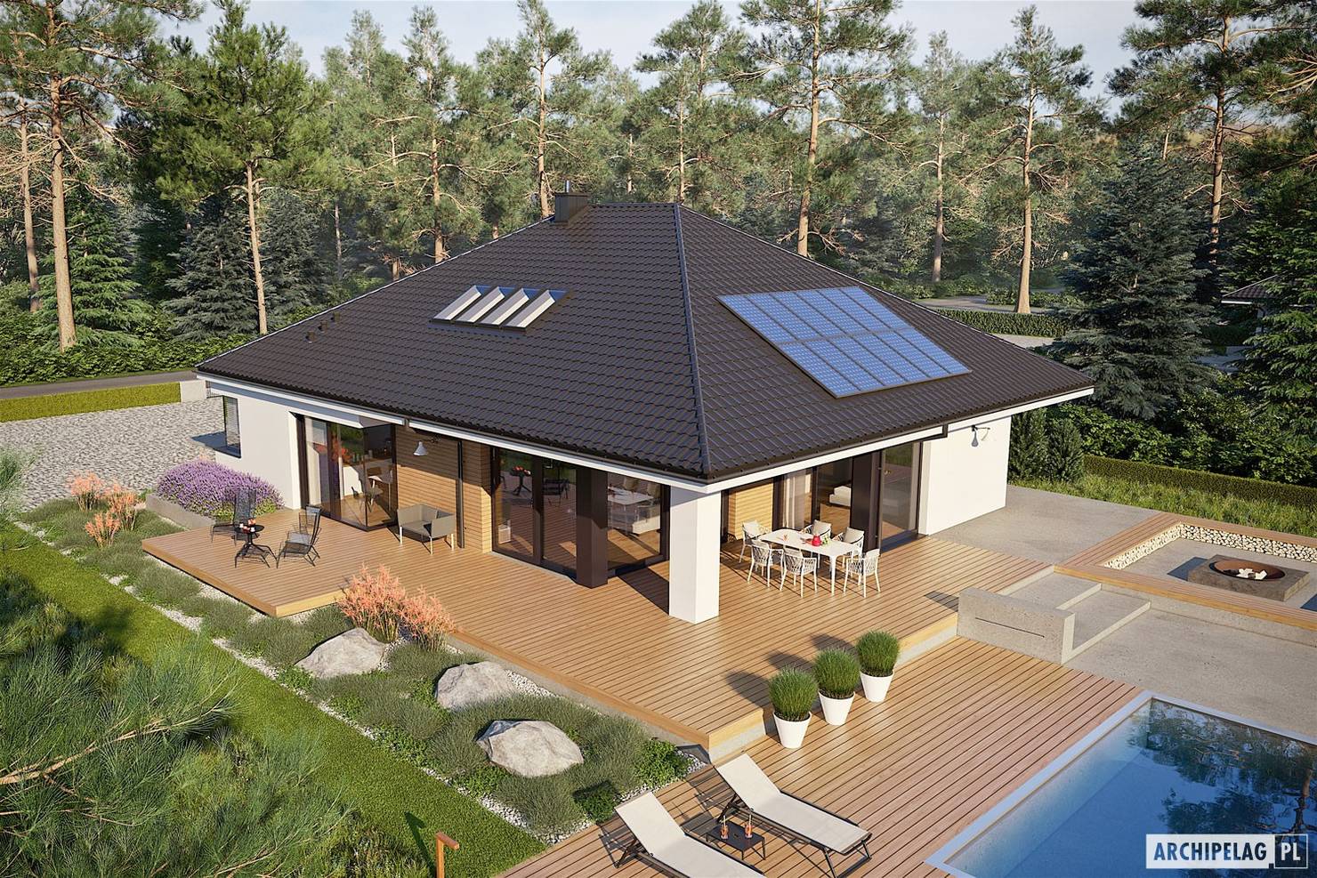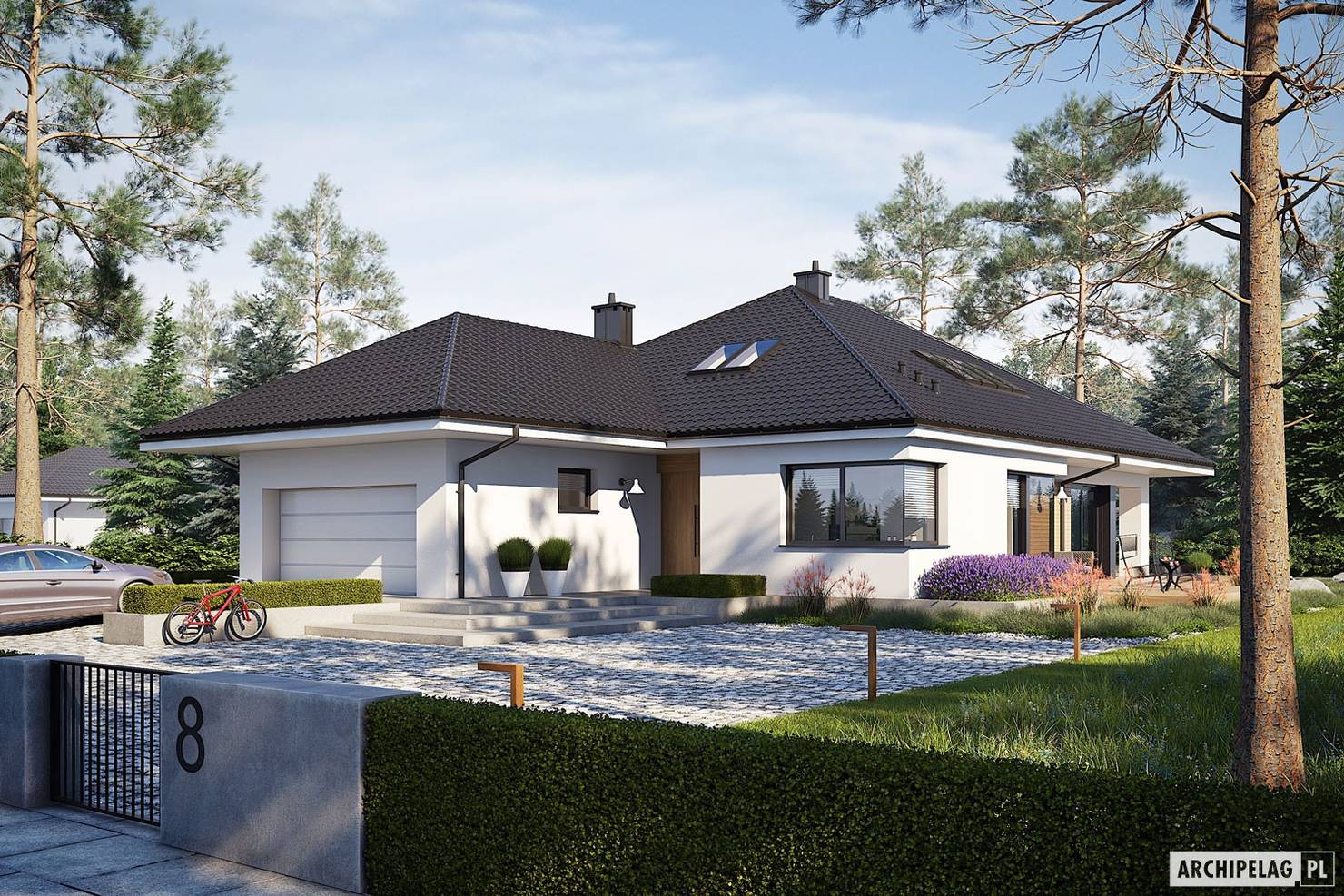 Архитектурная студия «Архипелаг» представила проект компактного дома в стиле модерн, идеально подходящего для небольшой семьи. Общая площадь застройки составляет 247 квадратных метров при размерах здания 14,3 на 21,5 метра. Основное жилое пространство занимает 143 м², дополнено котельной (11 м²), гаражом на две машины (30 м²) и мансардой, которую можно обустроить как полноценный второй этаж (73 м²).